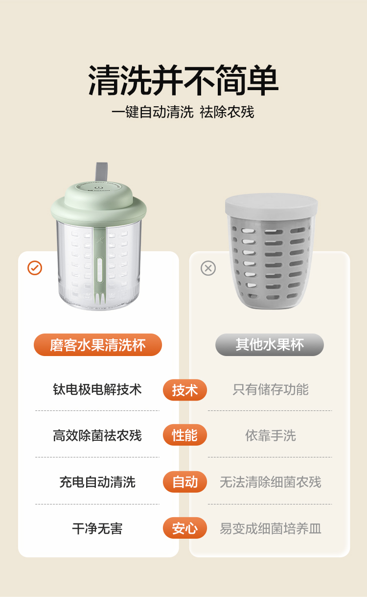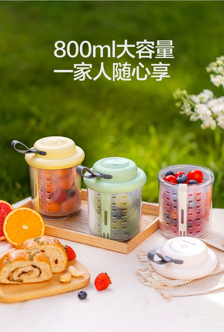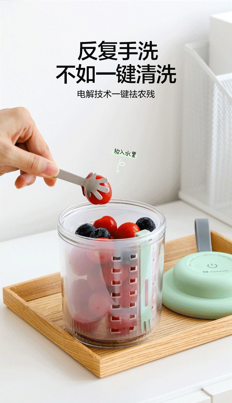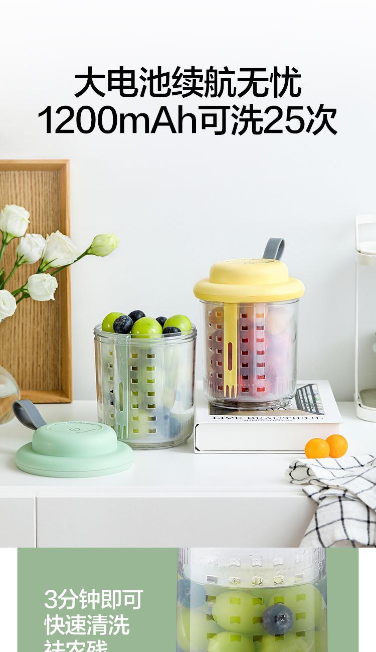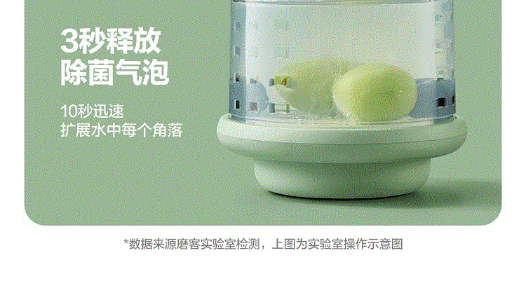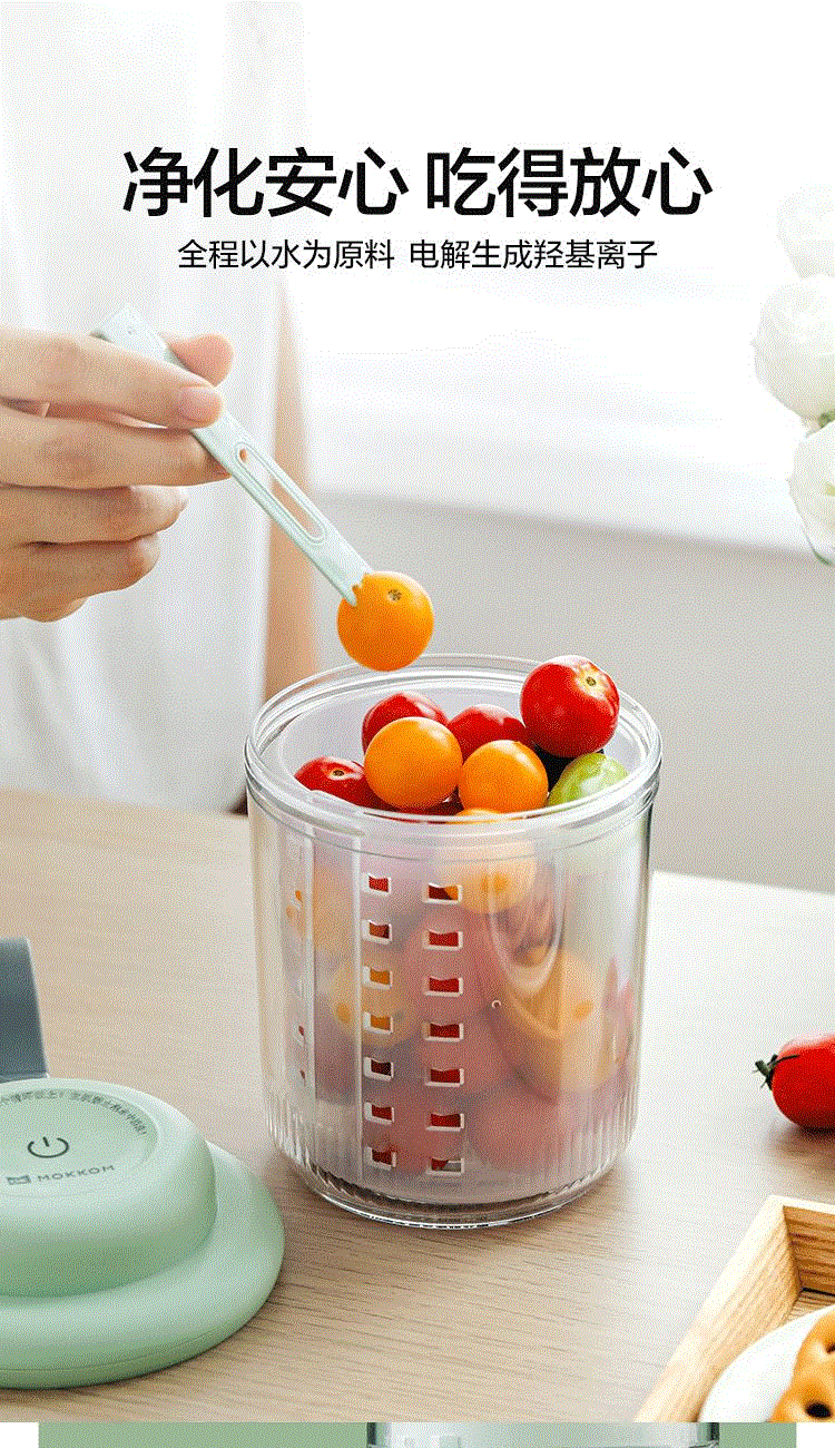 1、电解技术,一键祛农残 2、3分钟即可快速清洗祛农残,净化安心,吃得放心 3、3秒释放气泡,10秒迅速扩展水中每个角落 4、迷你小巧。800mL大容量,一家人随心享用 5、双层沥水,密封防漏。加厚材质,经久耐用 6、大电池续航无忧,1200mAh充满电可洗25次