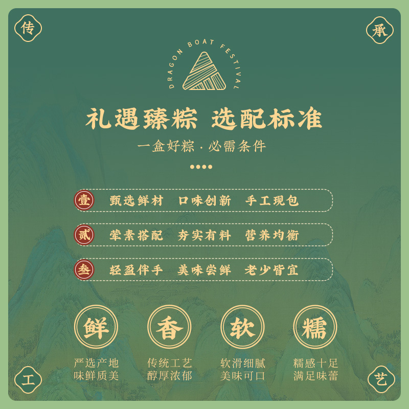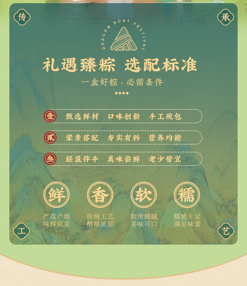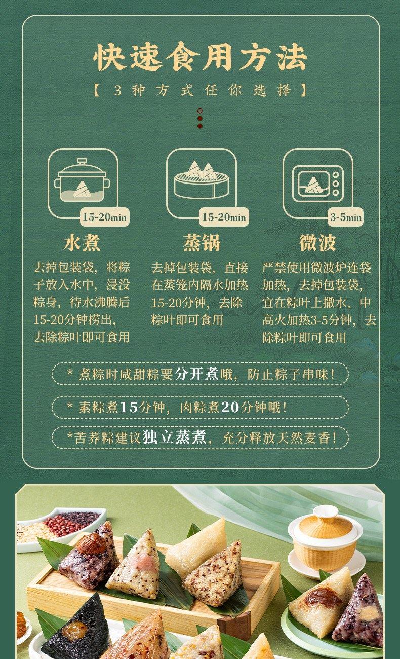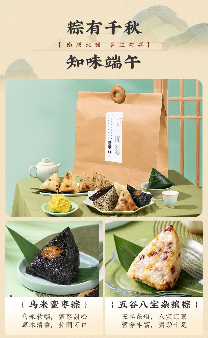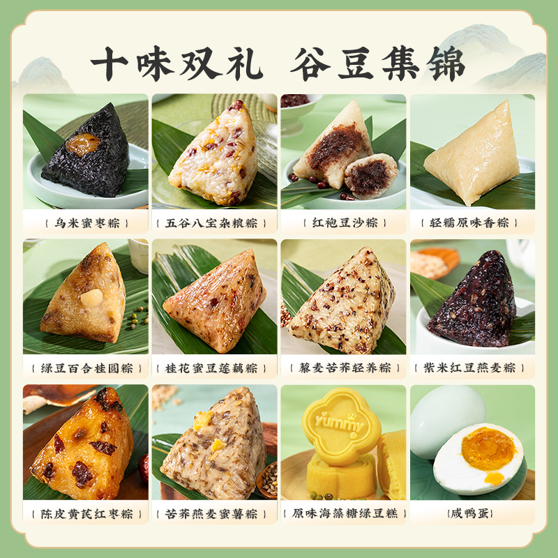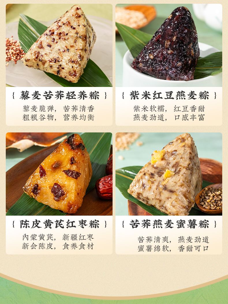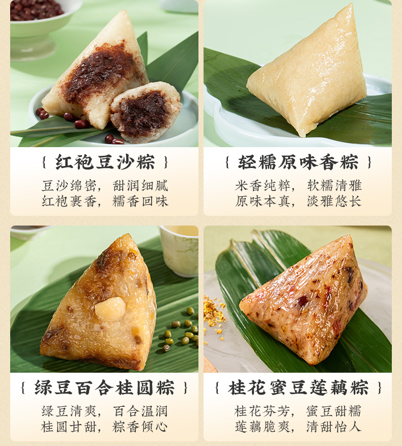 产品卖点:十款创新甜粽,地理标志主食材糯米,传统风味与轻养食材兼顾