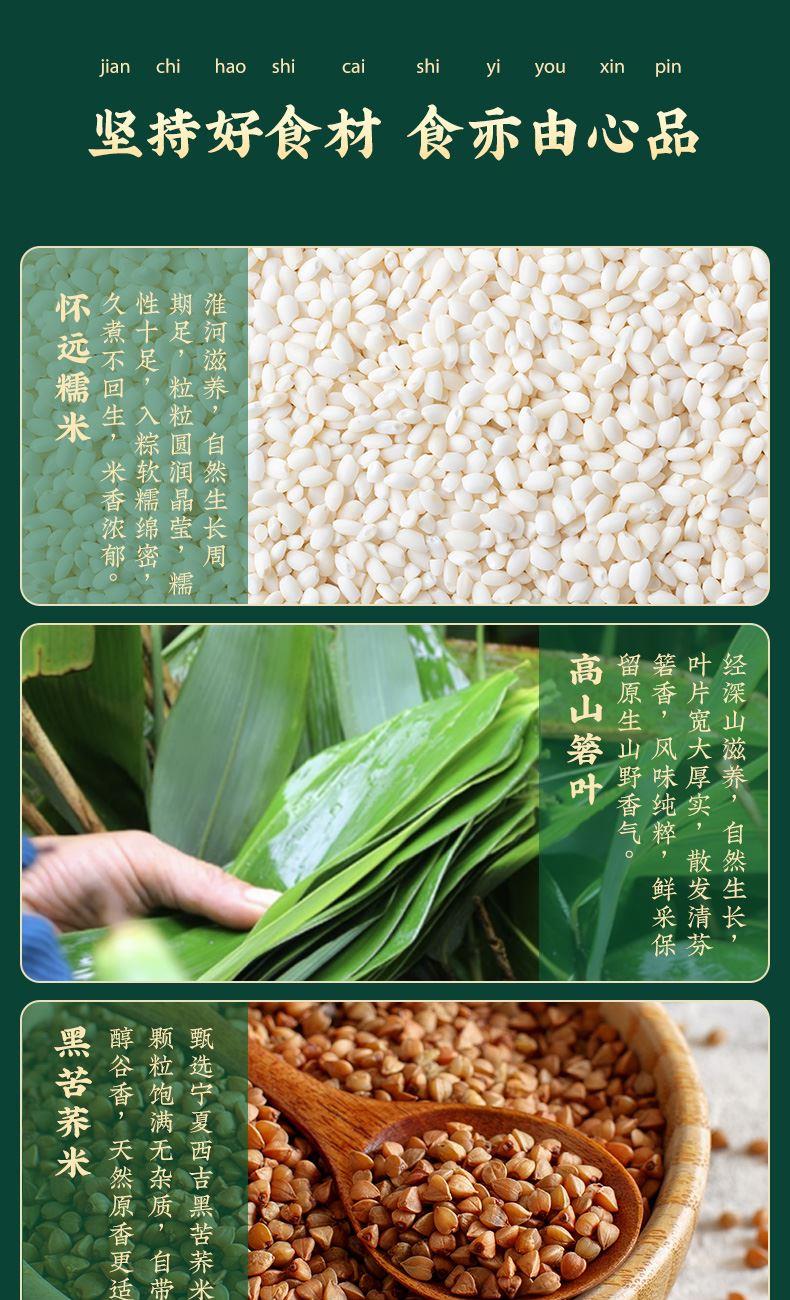 1、食材甄选安徽怀远糯米,颗粒饱满莹润,蒸后口感轻糯绵软、香润不粘牙,米香纯粹悠长;搭配野生高山箬叶,叶厚清香,将山野自然清香沁入粽米,粽叶香与米香交融