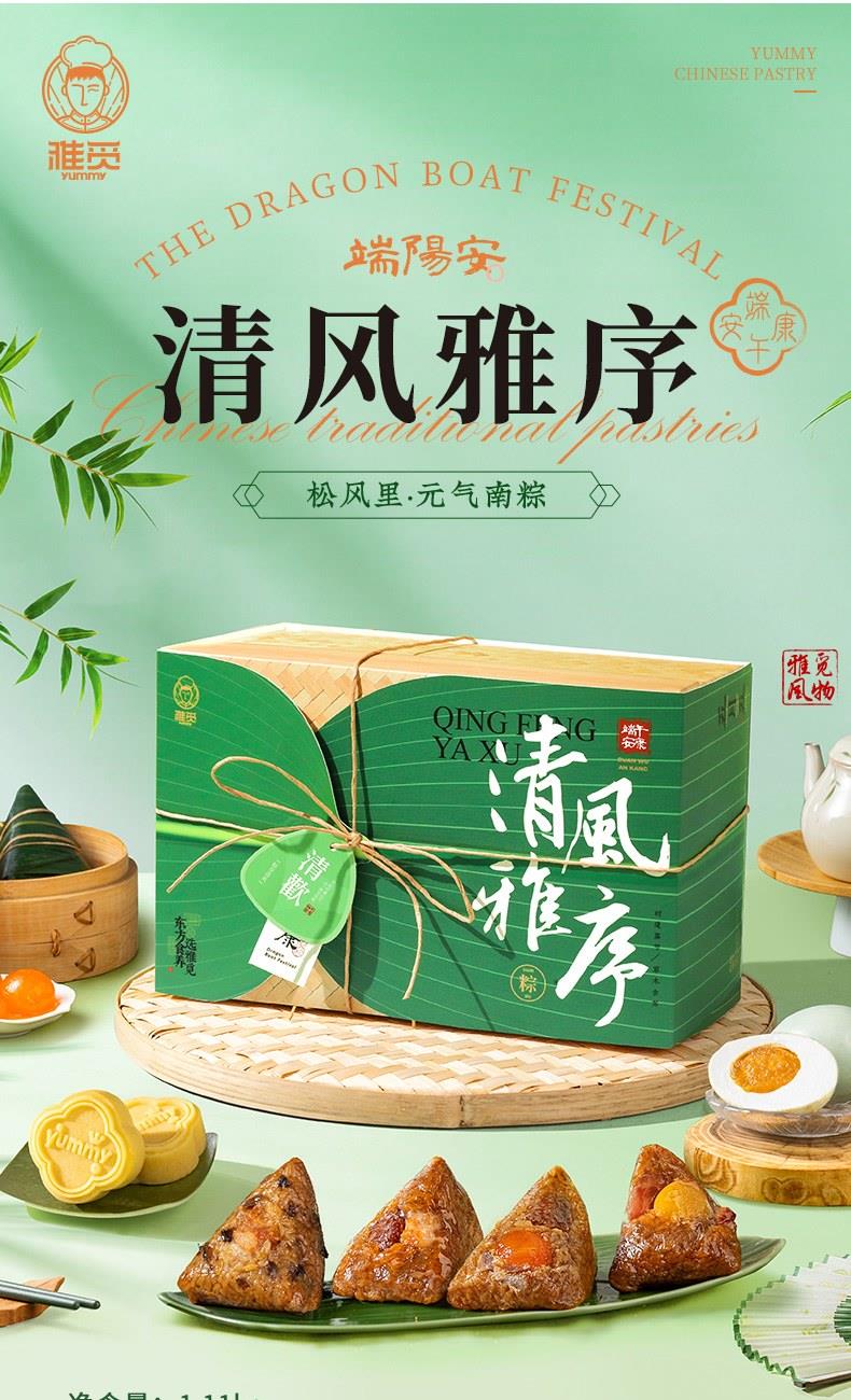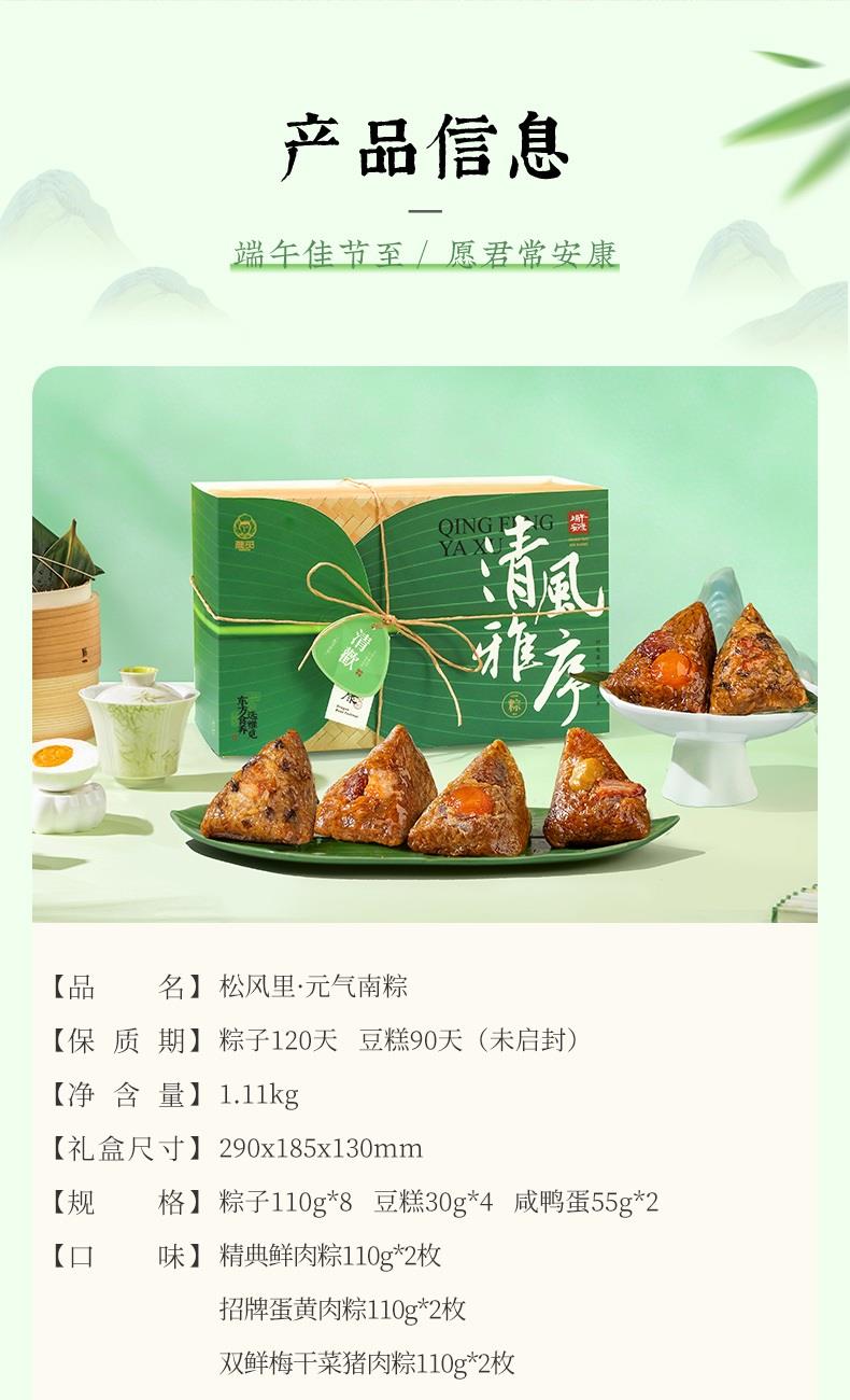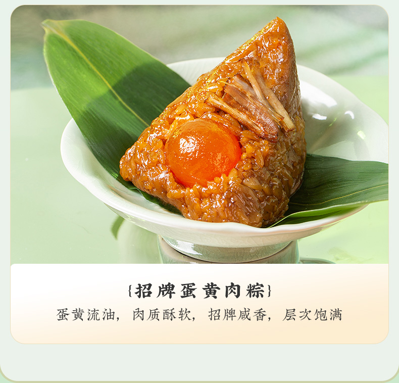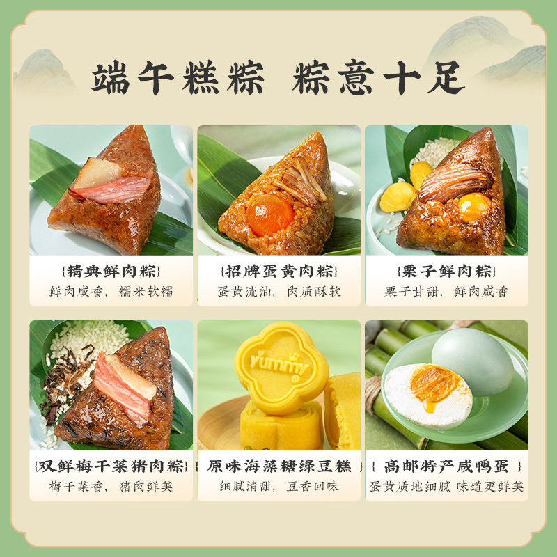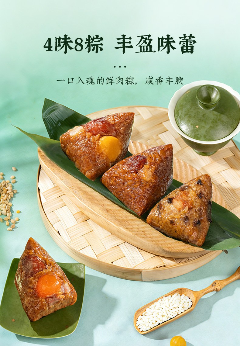 产品卖点:4味8粽+4枚豆糕+2枚咸鸭蛋,咸香与清甜搭配,解腻爽口,口味层次十足