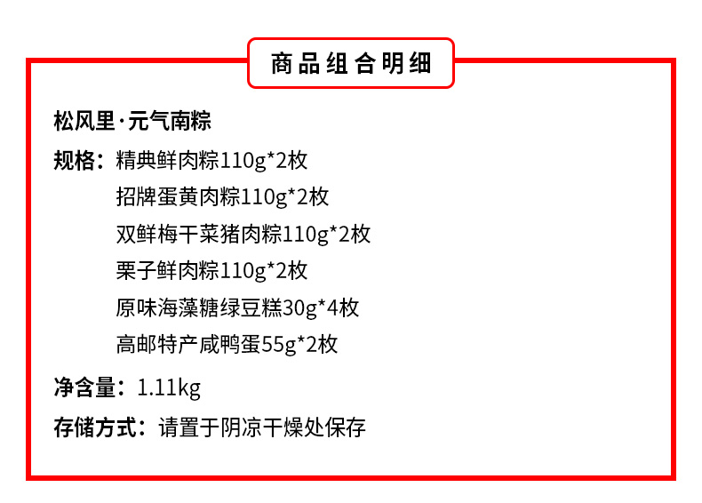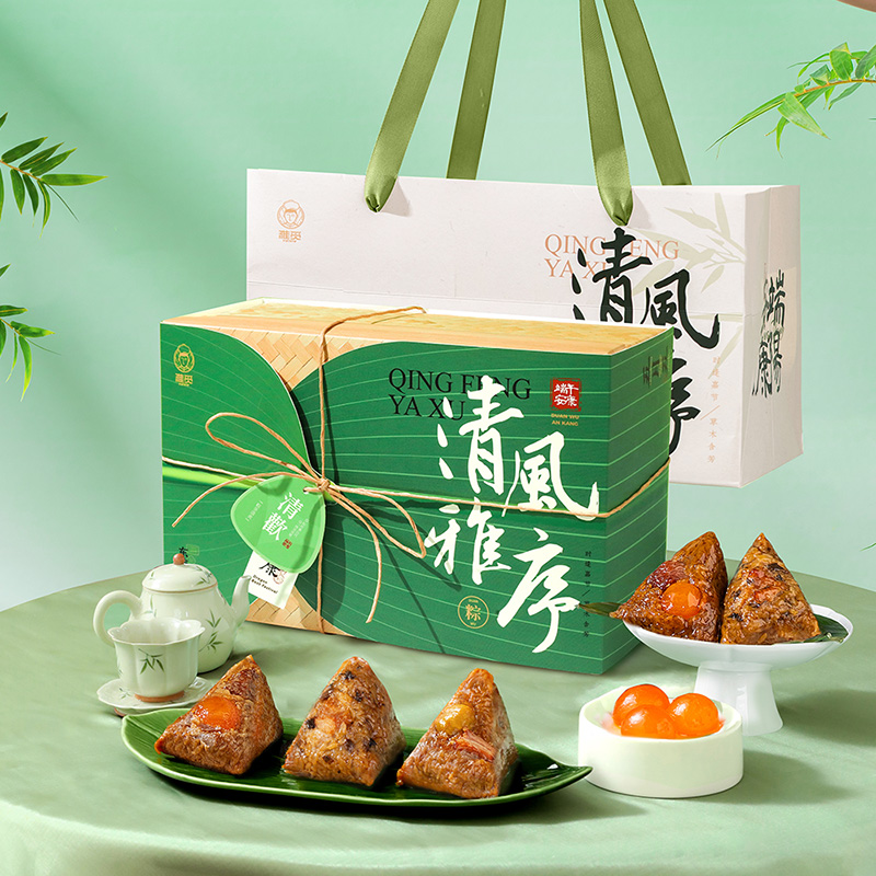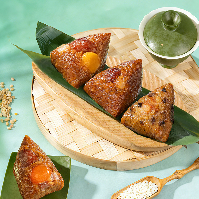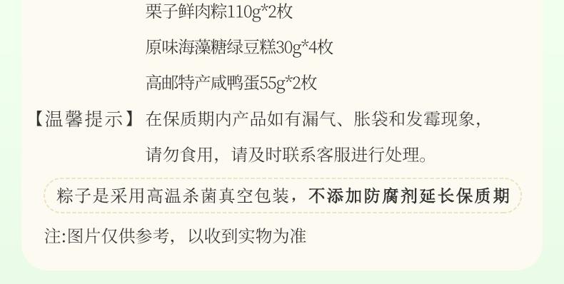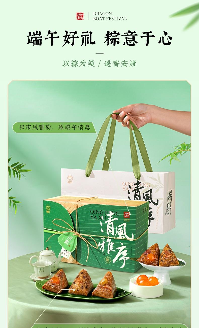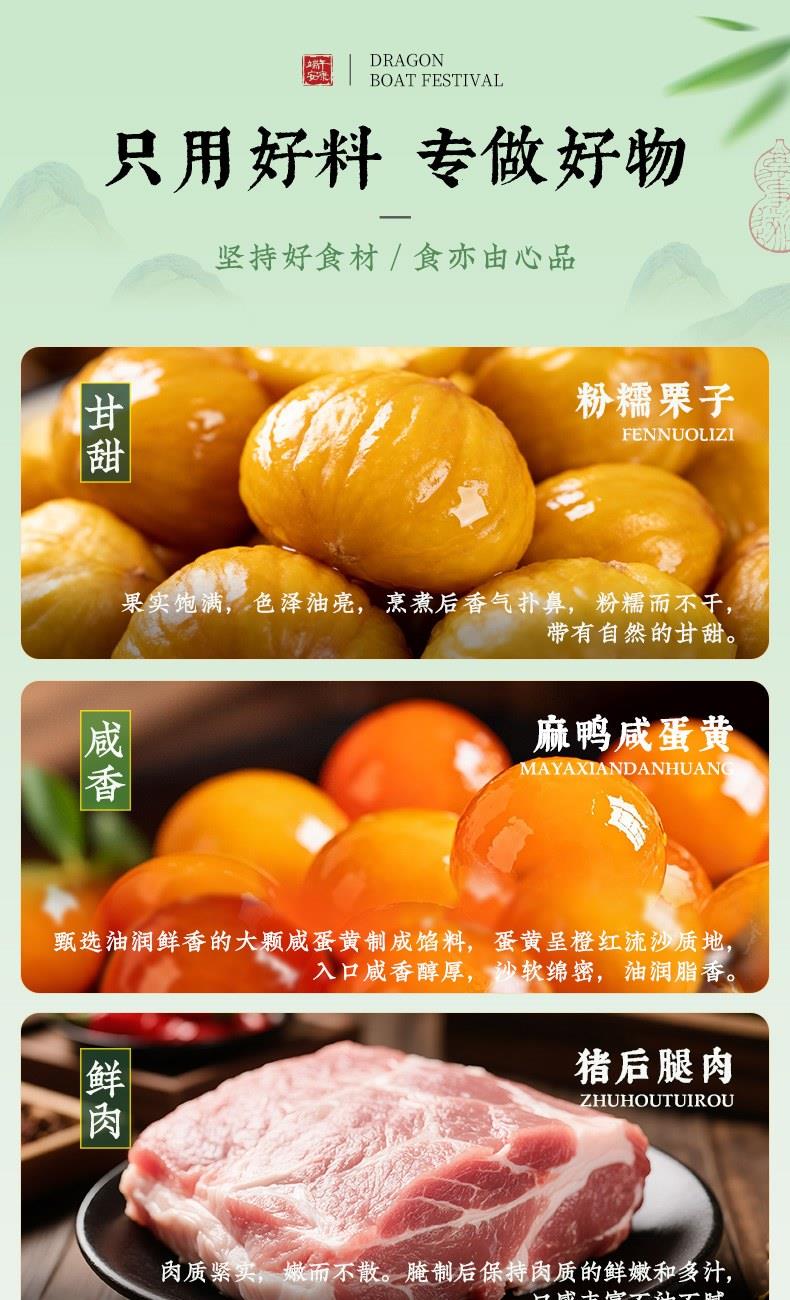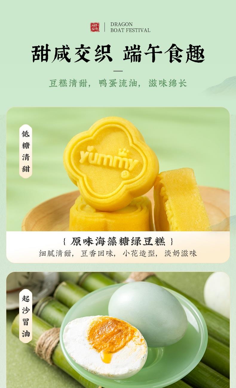 产品卖点:4味8粽+4枚豆糕+2枚咸鸭蛋,咸香与清甜搭配,解腻爽口,口味层次十足