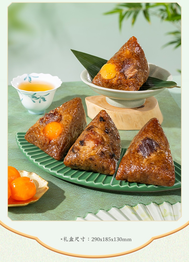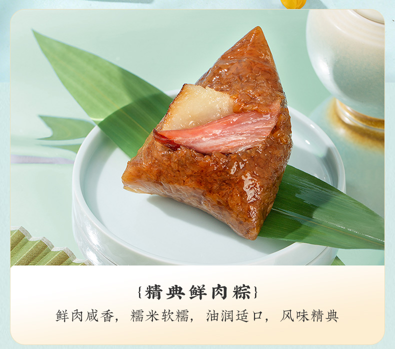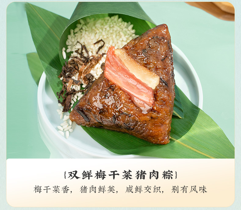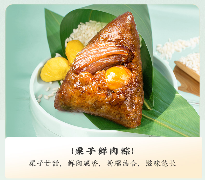 2、经典鲜肉粽醇香多汁、咸香入味;招牌藏珍蛋黄肉粽蛋黄沙糯流油、肉香浓郁;双鲜梅干菜猪肉粽梅菜醇香、鲜而不腻;栗子鲜肉粽栗子粉糯、肉香醇厚,每一口都料足味浓