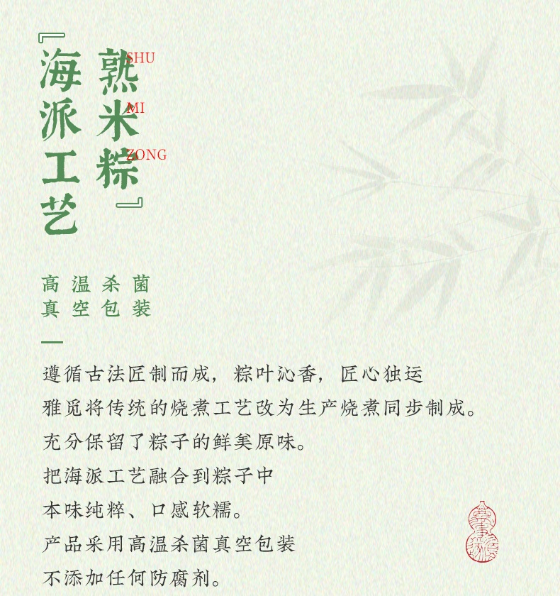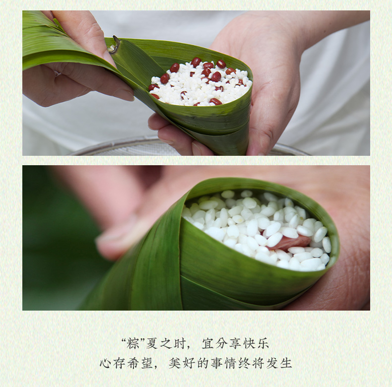 1、食材甄选安徽怀远糯米,颗粒饱满莹润,蒸后口感轻糯绵软、香润不粘牙,米香纯粹悠长;搭配野生高山箬叶,叶厚清香,将山野自然清香沁入粽米,粽叶香与米香交融