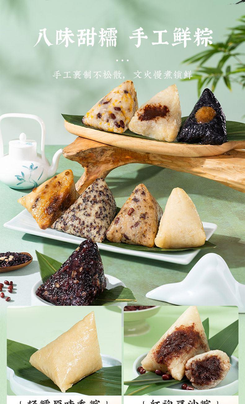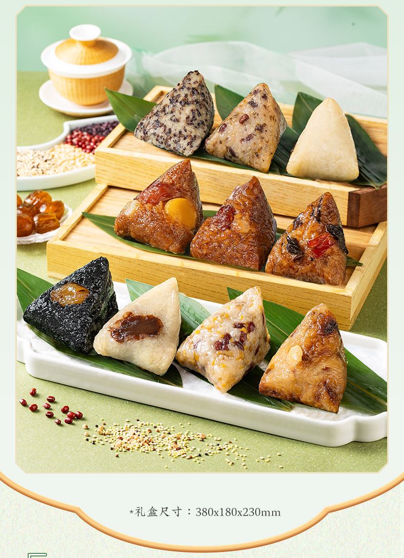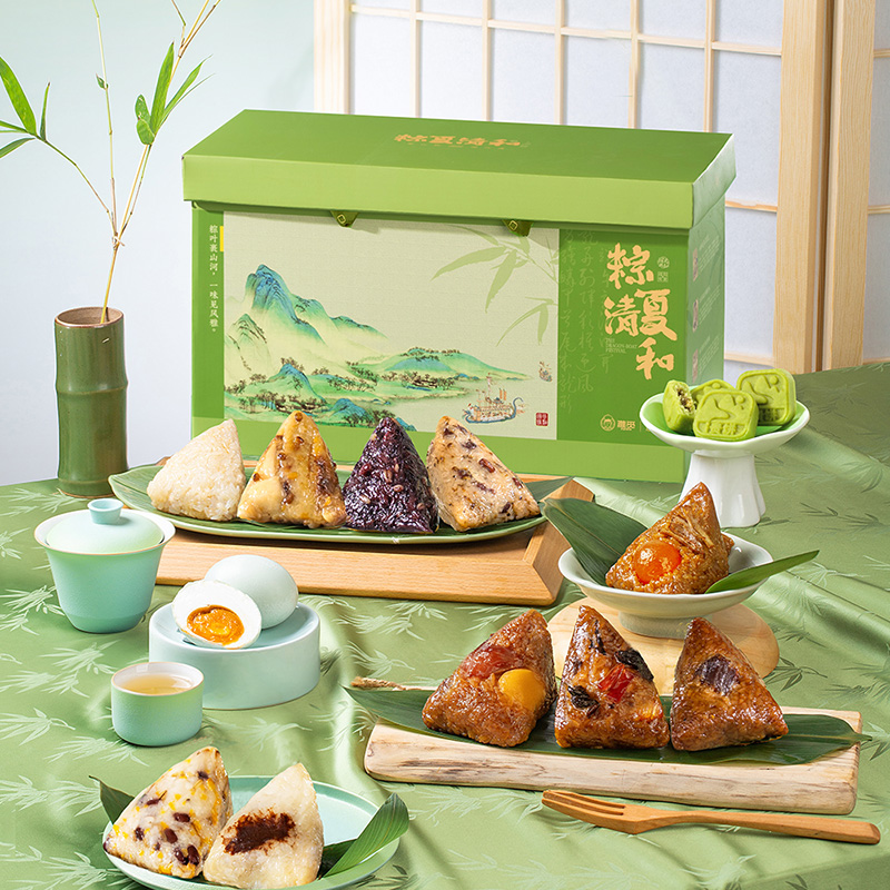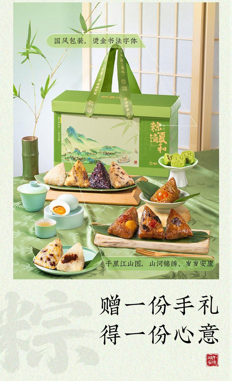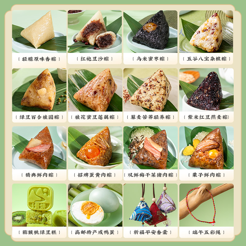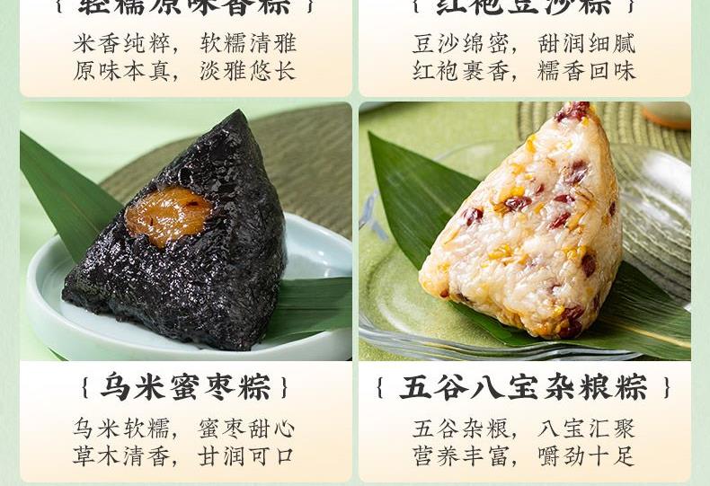 产品卖点:兼顾南北口味,十二款风味甜咸搭配,甜粽更多选择,搭配灵活、选择丰富,美味与端午民俗仪式感兼备。