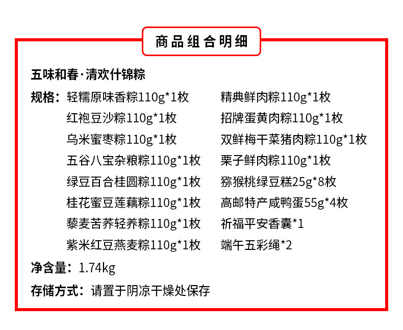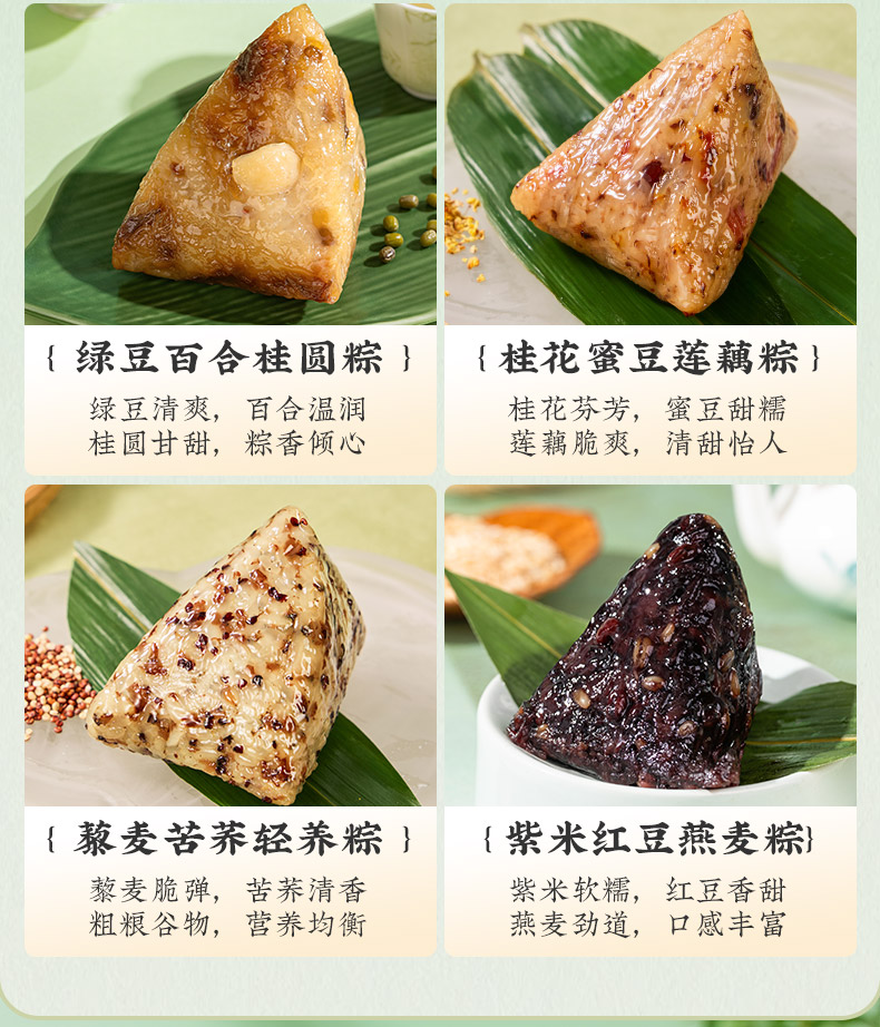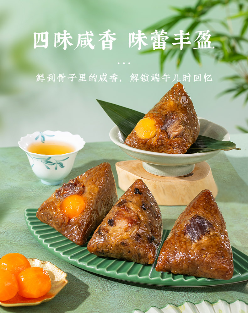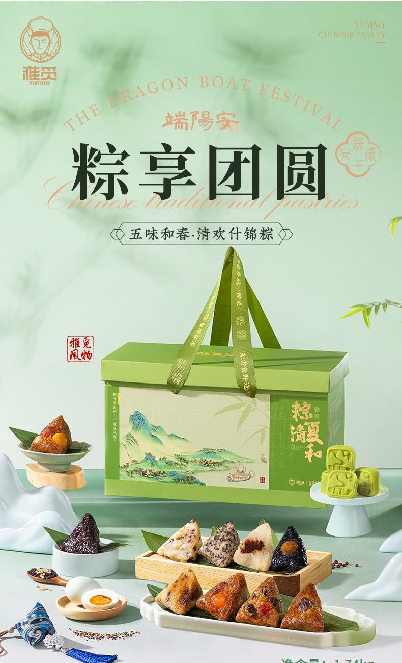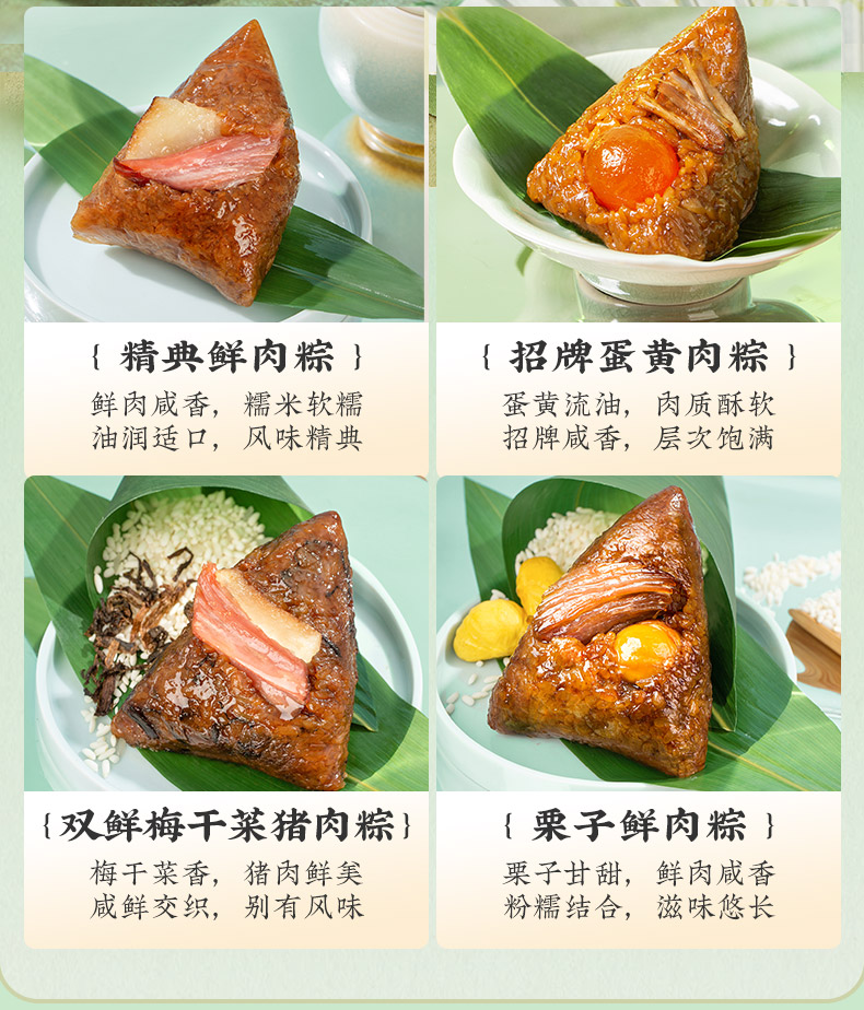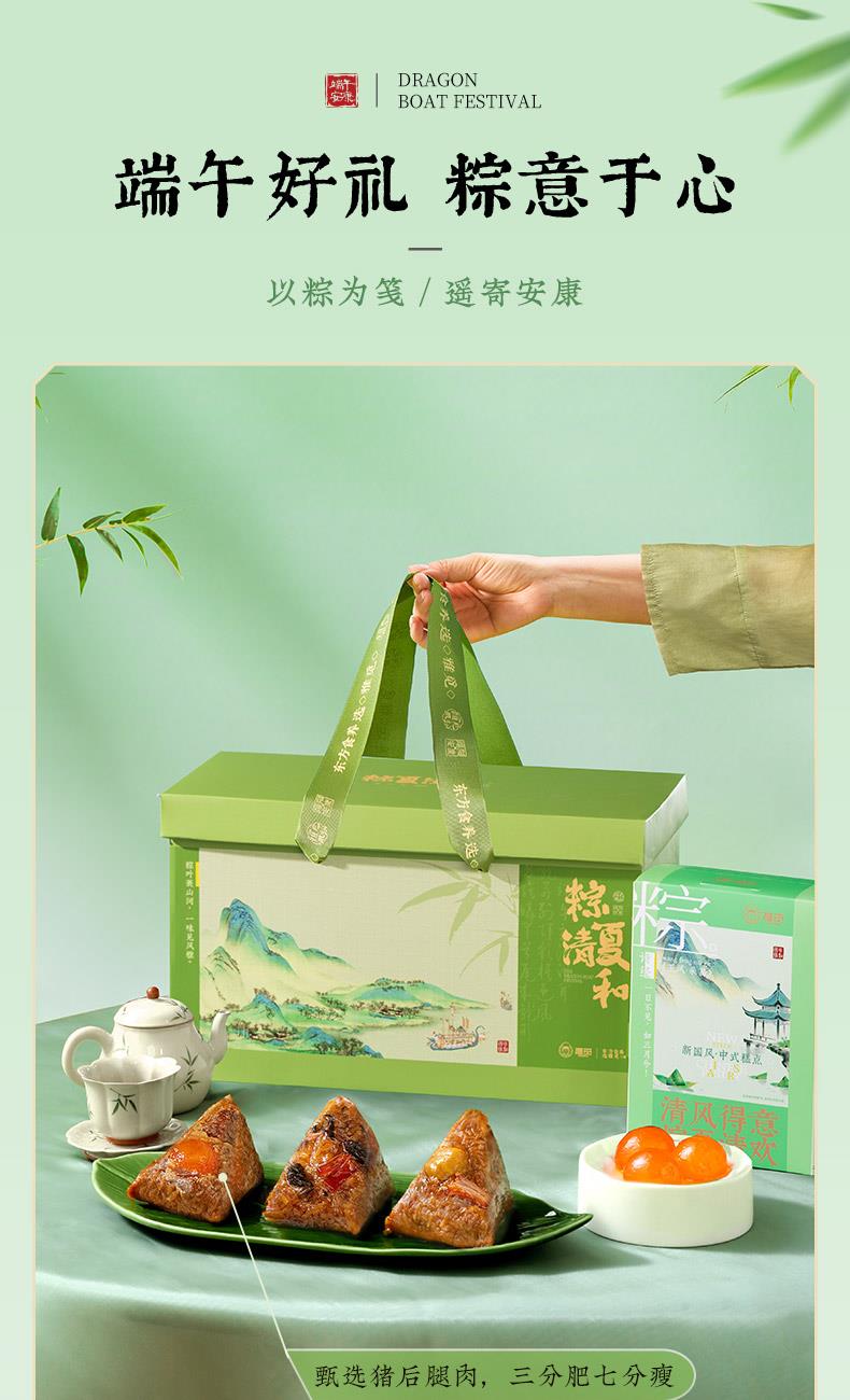 产品卖点:兼顾南北口味,十二款风味甜咸搭配,甜粽更多选择,搭配灵活、选择丰富,美味与端午民俗仪式感兼备。