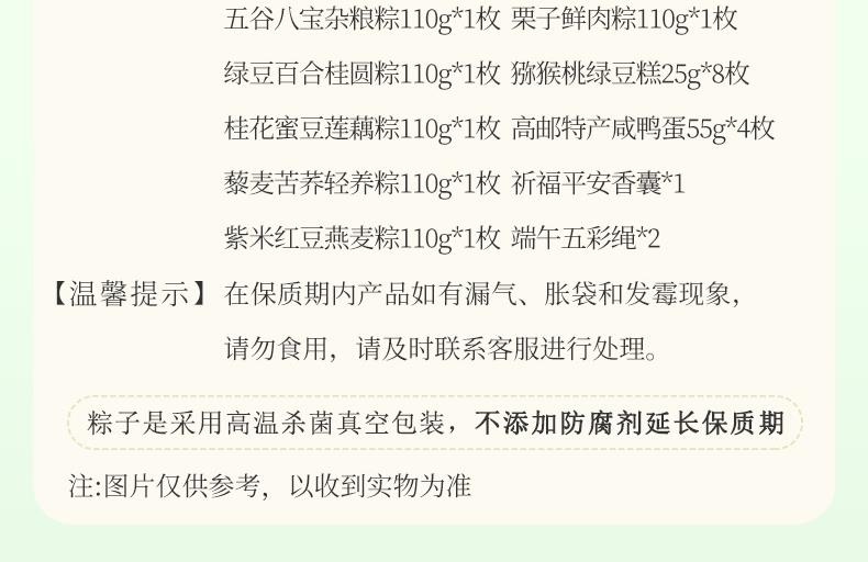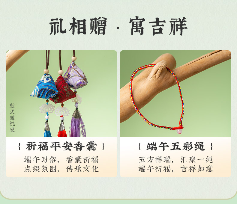 4、附赠祈福平安香囊、精致五彩绳,承载端午传统习俗,寓意吉祥安康,为礼盒增添仪式感,送礼更显用心别