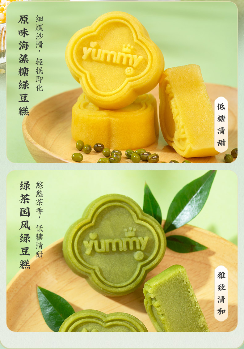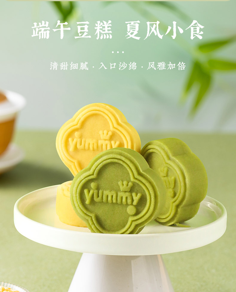 4、豆糕甄选东南亚绿豆,经数道工序处理为脱皮绿豆,入口细腻沙滑,清凉解腻