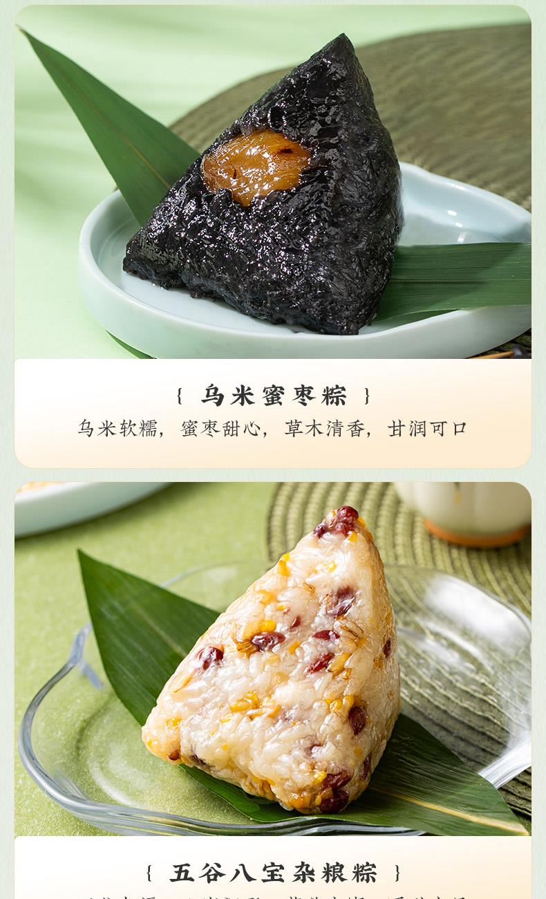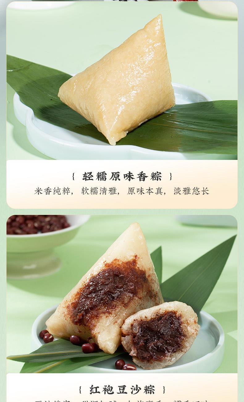 2、轻糯原味香粽还原本味,米香纯粹;红袍豆沙粽绵密细腻、甜润沙软;乌米蜜枣粽乌米醇香、蜜枣清甜;五谷八宝杂粮粽营养均衡、谷香浓郁,每一口都软糯香甜、料足味美