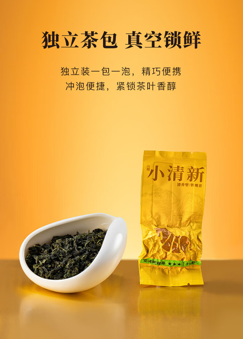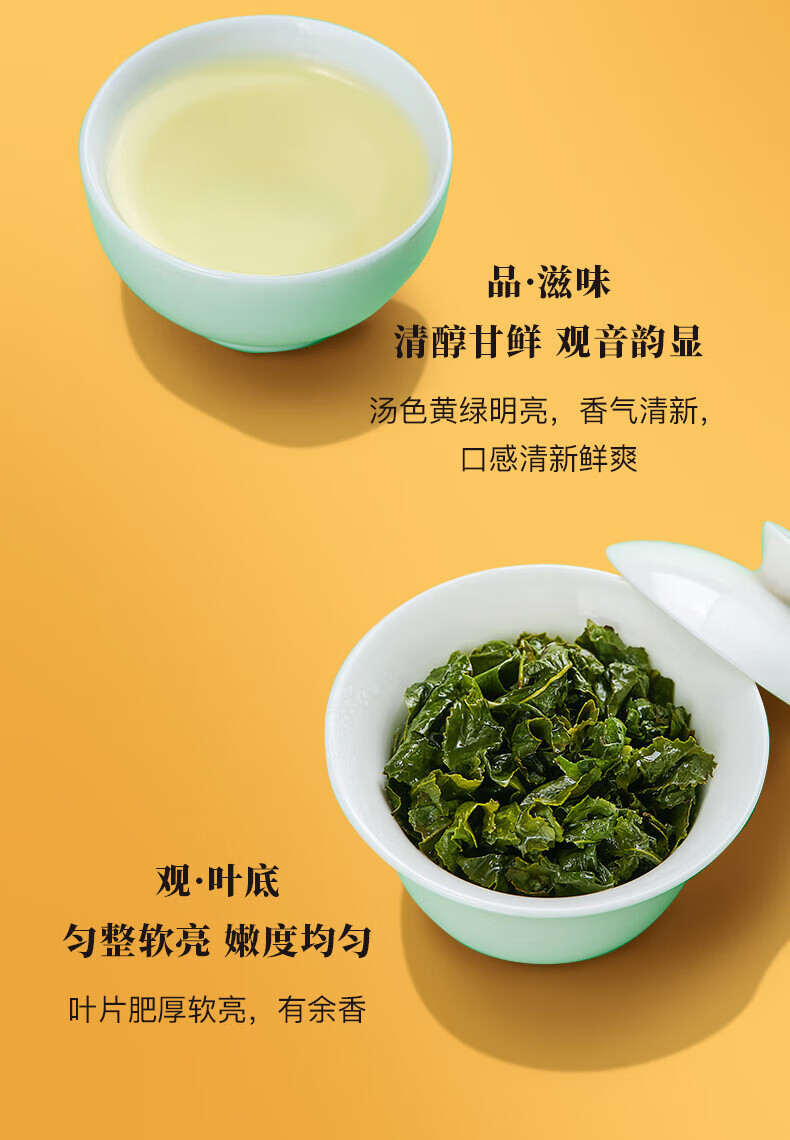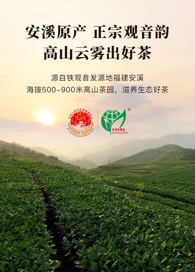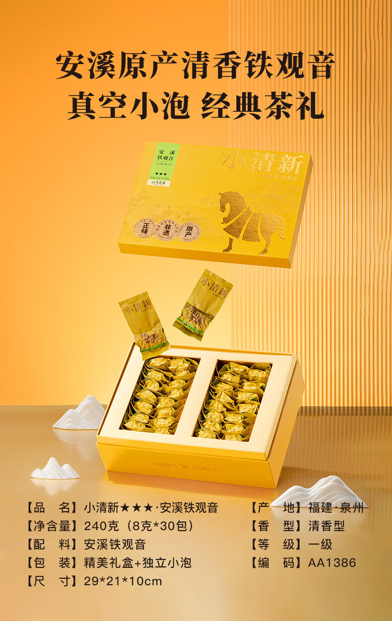 编码:AA1386 等级:一级 产 地:福建·泉州 香 型:清香型 配 料:安溪铁观音 净 含 量:240克(8g*30包) 保质期:24个月 尺寸:29*21*10cm