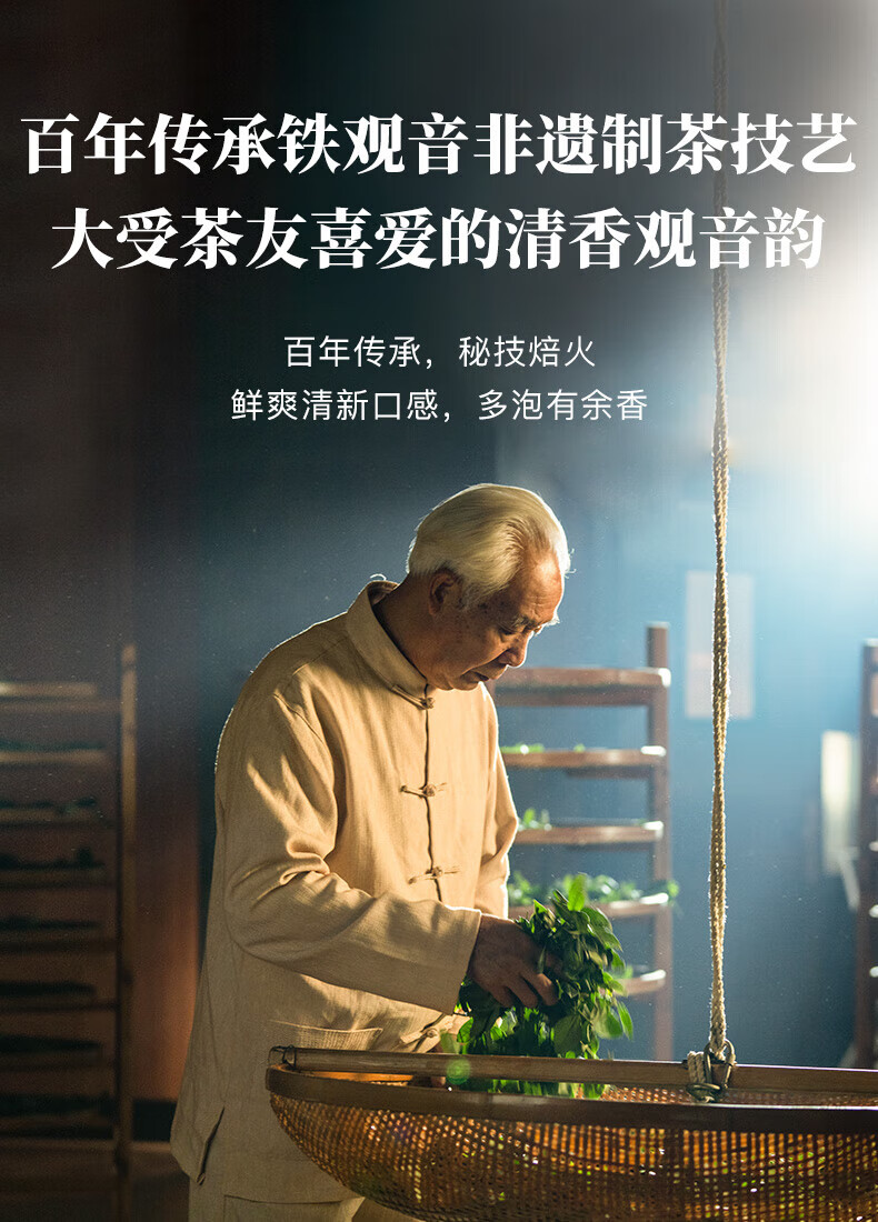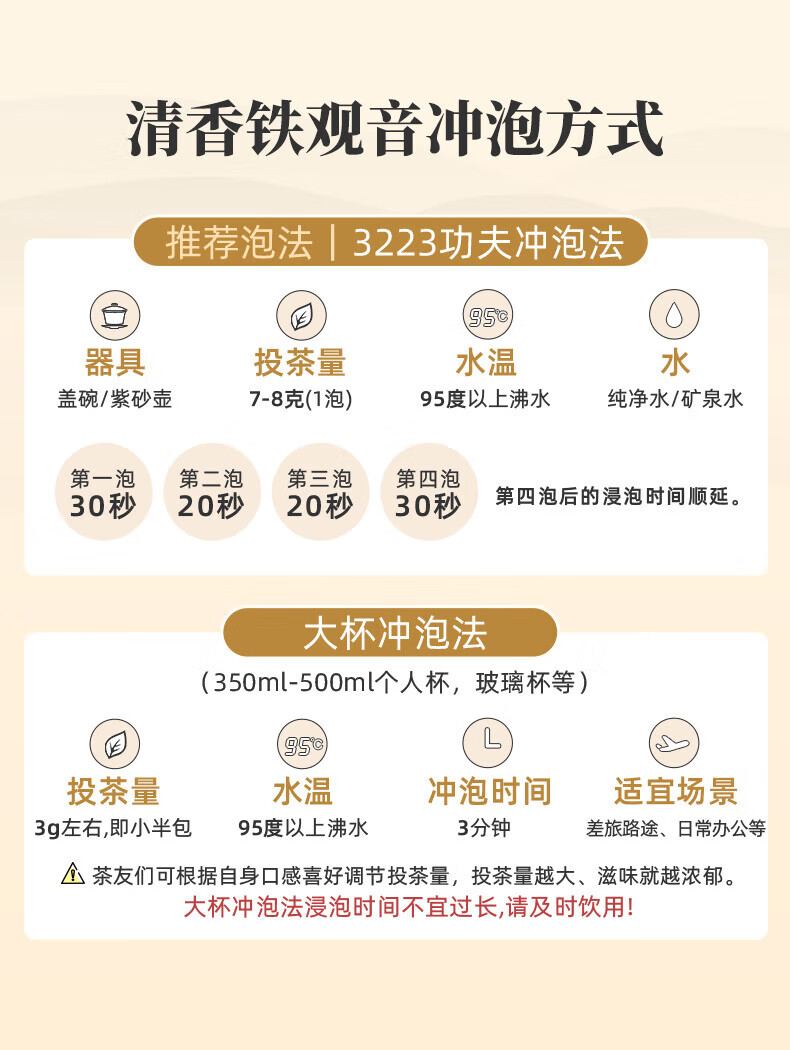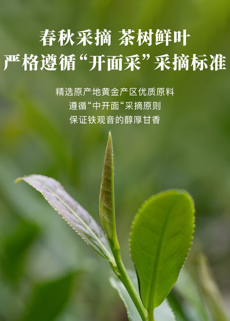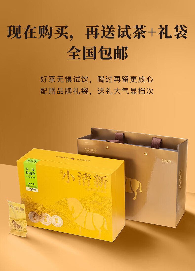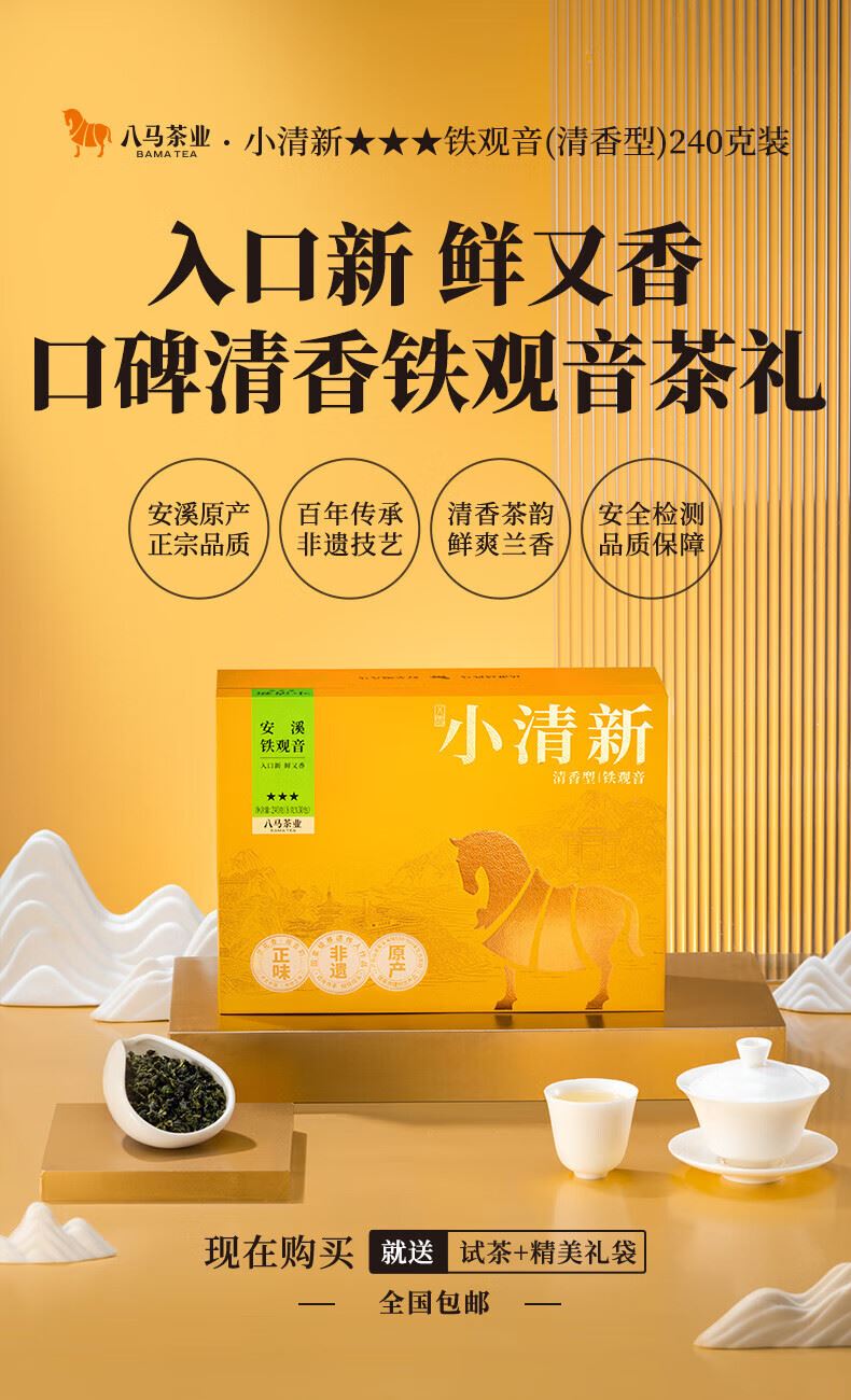 编码:AA1386 等级:一级 产 地:福建·泉州 香 型:清香型 配 料:安溪铁观音 净 含 量:240克(8g*30包) 保质期:24个月 尺寸:29*21*10cm
