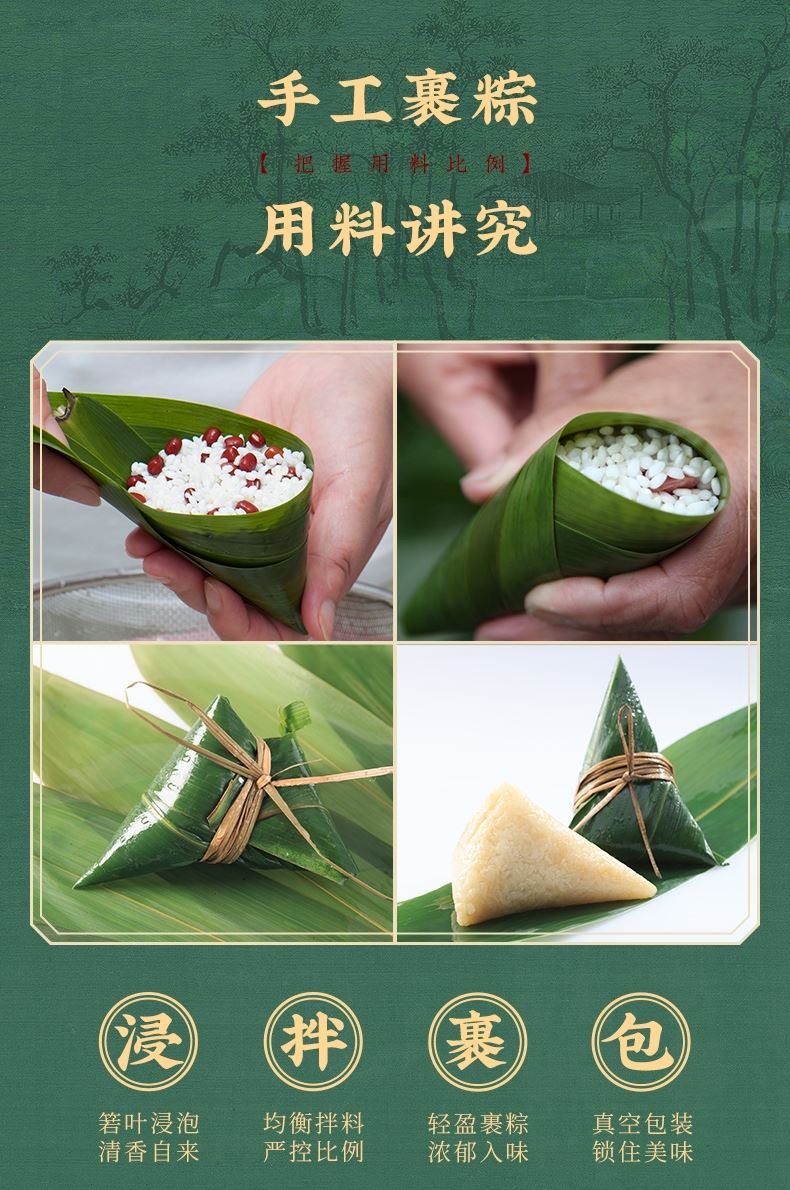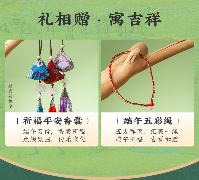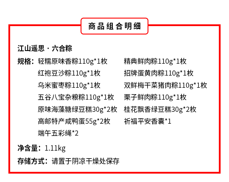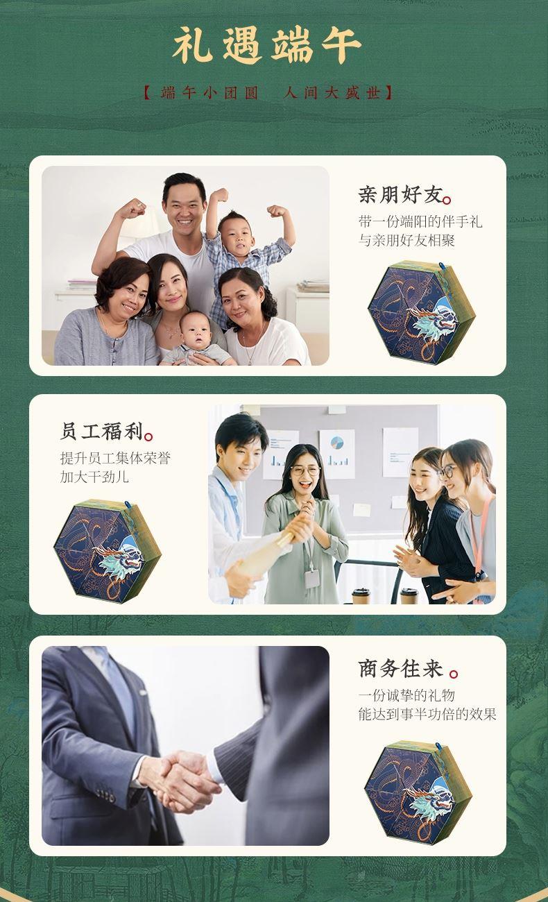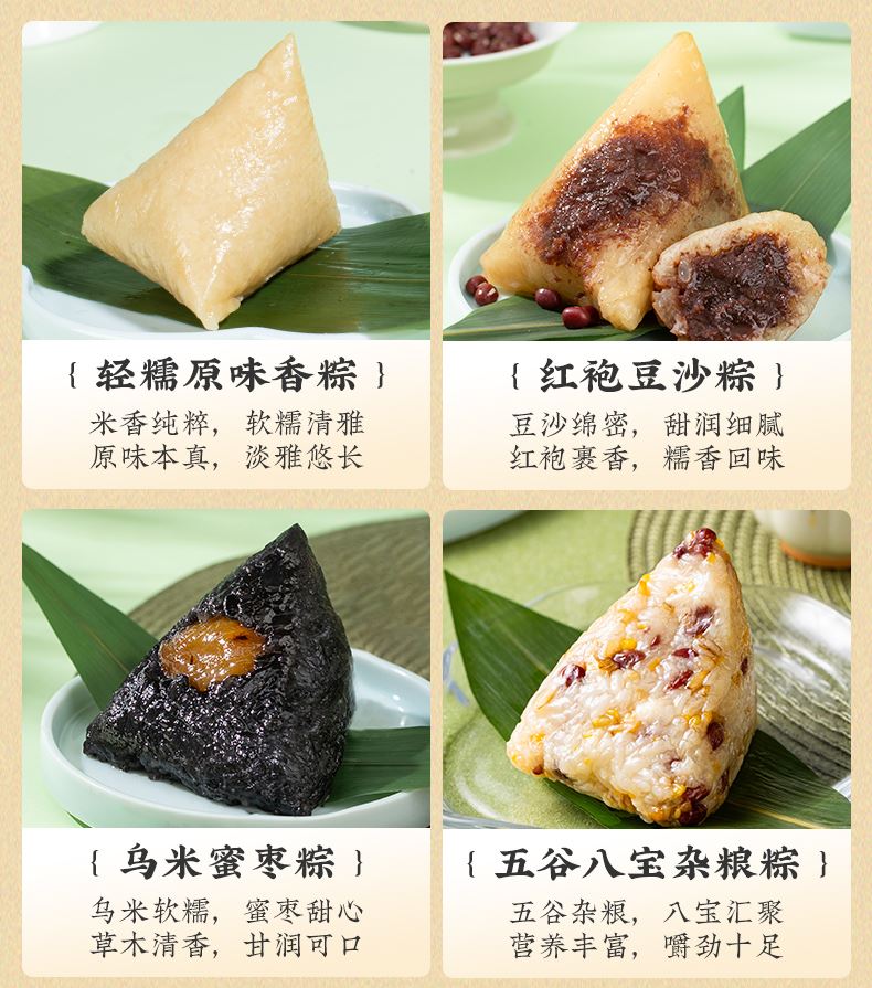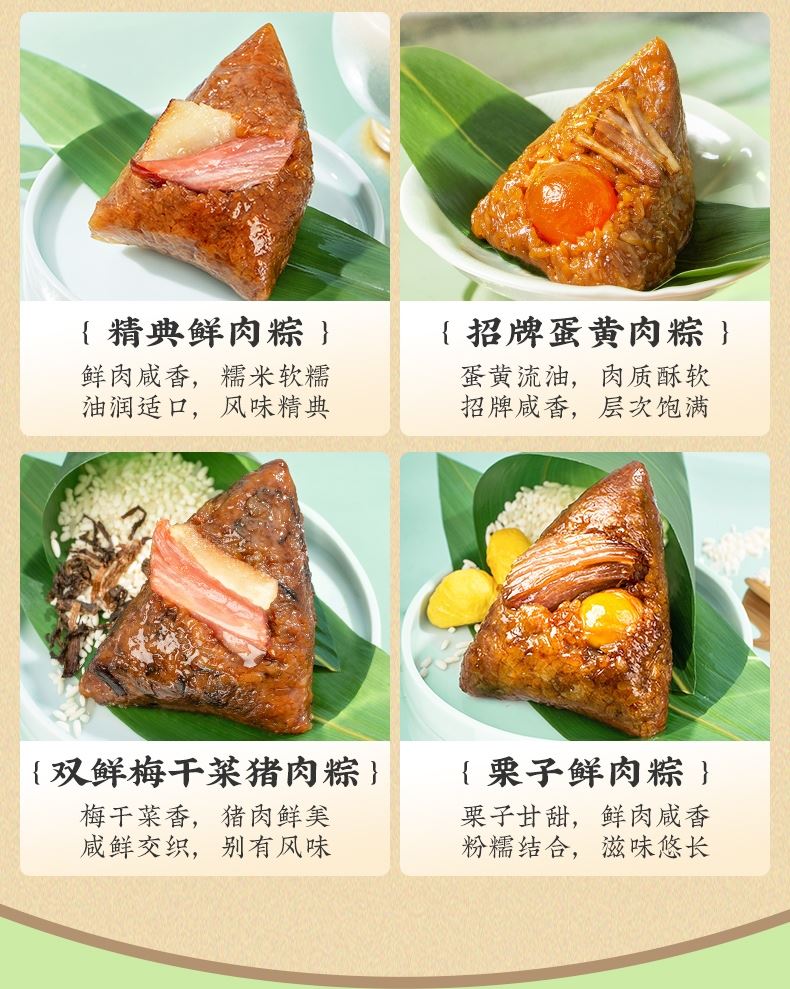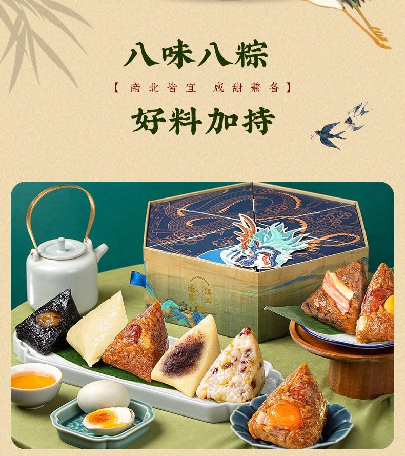 产品卖点:8味8粽+2味豆糕+两枚高邮特产咸鸭蛋,南咸北甜粽皆备,荤素搭配,营养均衡。