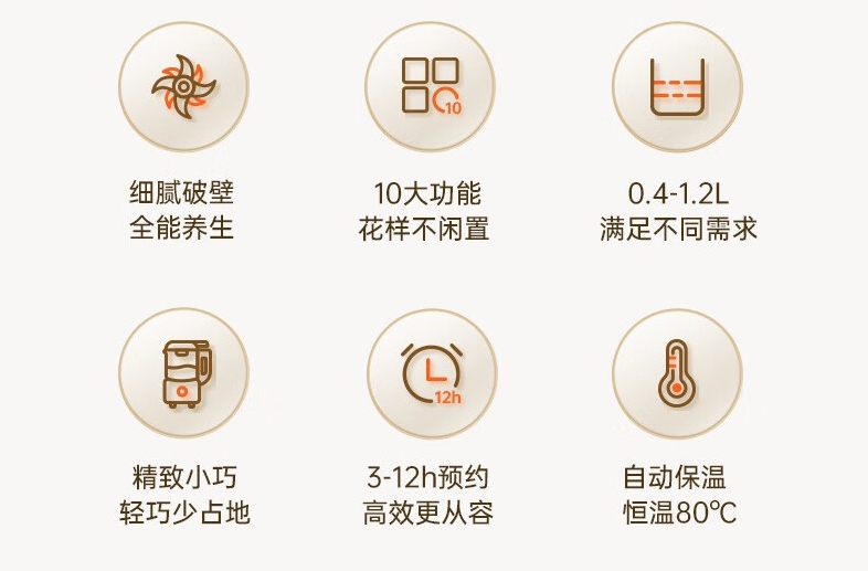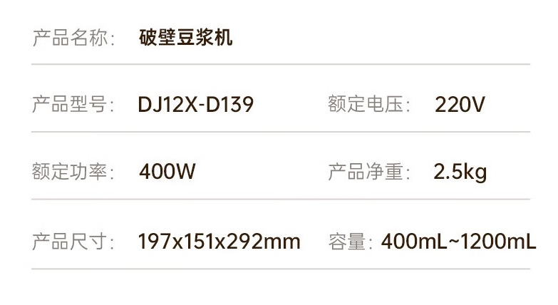 1.细腻破壁,多功能养生 2.精巧容量体积,质感外观 3.十大功能,花样纯享 4.1.2L容量,8页刀头.细腻免虑 5.3-12H高效预约 6.一键高温清洗 尺寸:197mm*151mm*292mm 规则:1 净重2.5KG