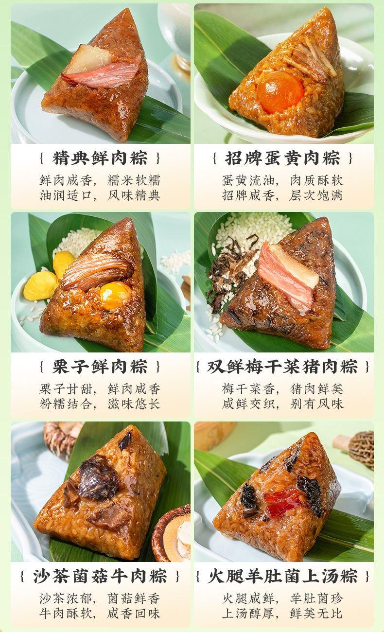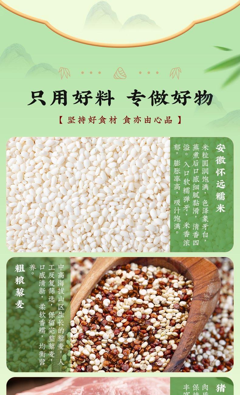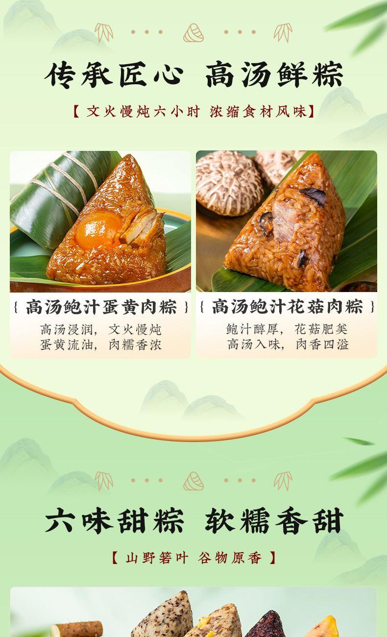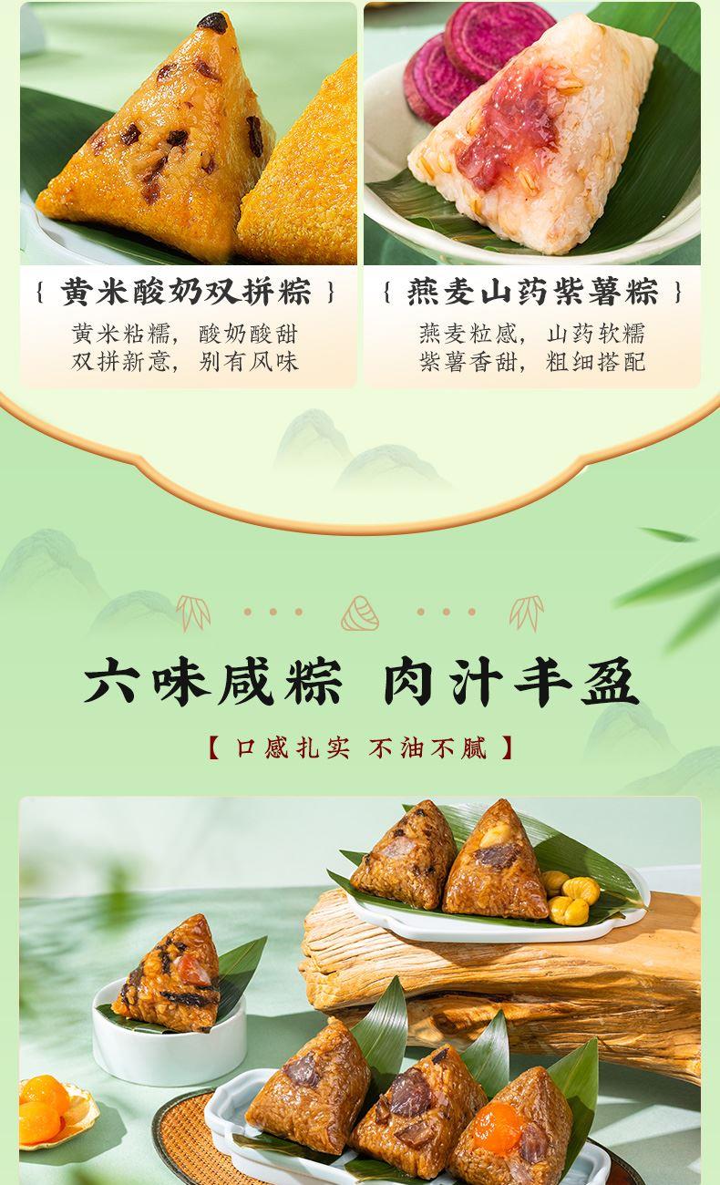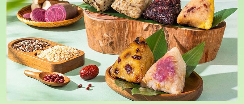 4.甜粽为食养粽,手工裹粽,精心烹调,用野生高山箬叶,包裹东北糯米,再分别融入五谷杂粮、燕麦、百合、三色藜麦、苦荞等食材,口感黏糯而有韧劲,百谷成粽,粗粮配比,健康食养,老少皆宜;肉粽均选用猪后腿肉,肉质鲜嫩,搭配油润咸蛋黄、糯香栗子、梅干菜等食材,营养丰富,每一个粽子都鲜香诱人,油香四溢。