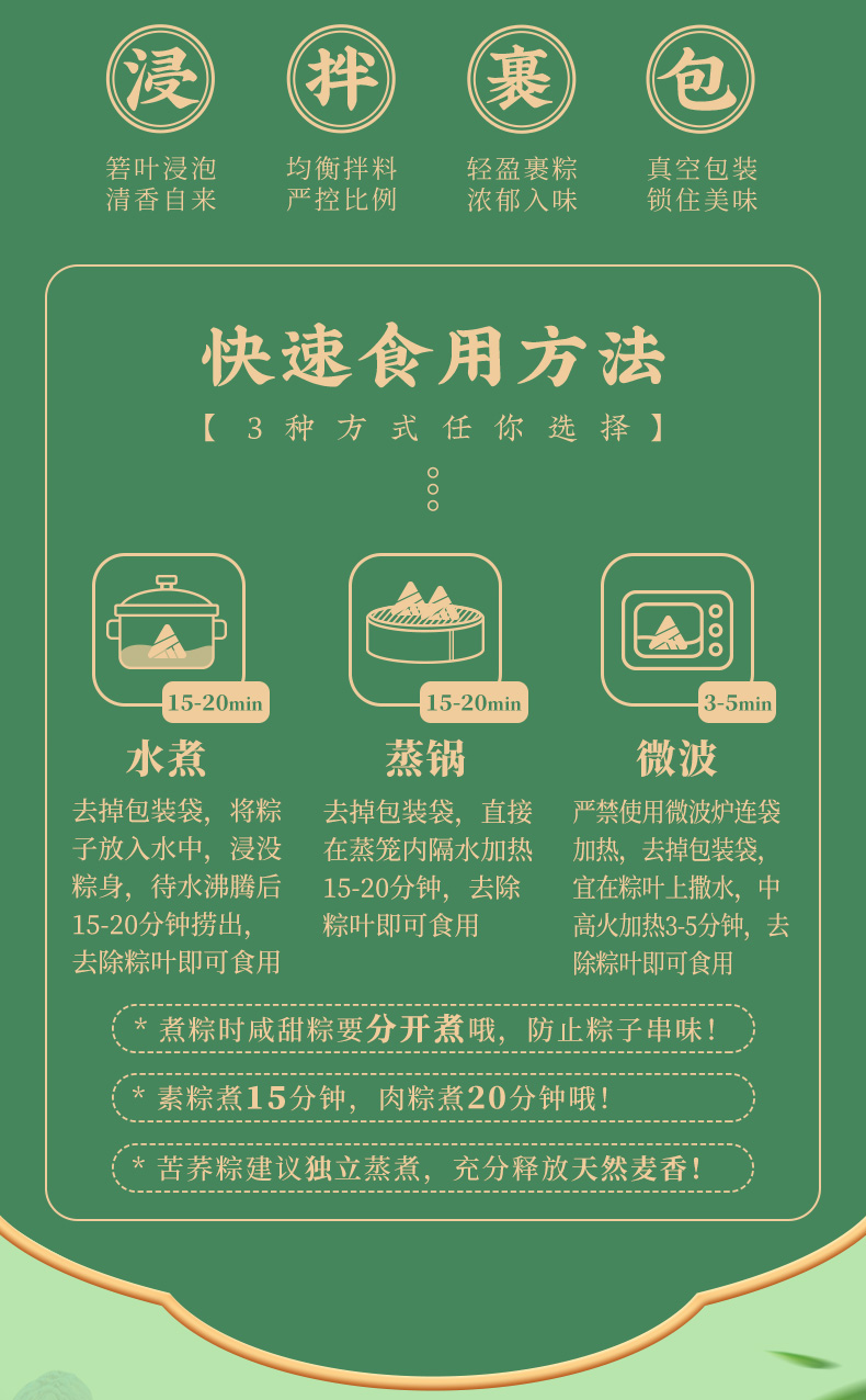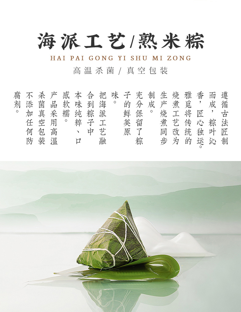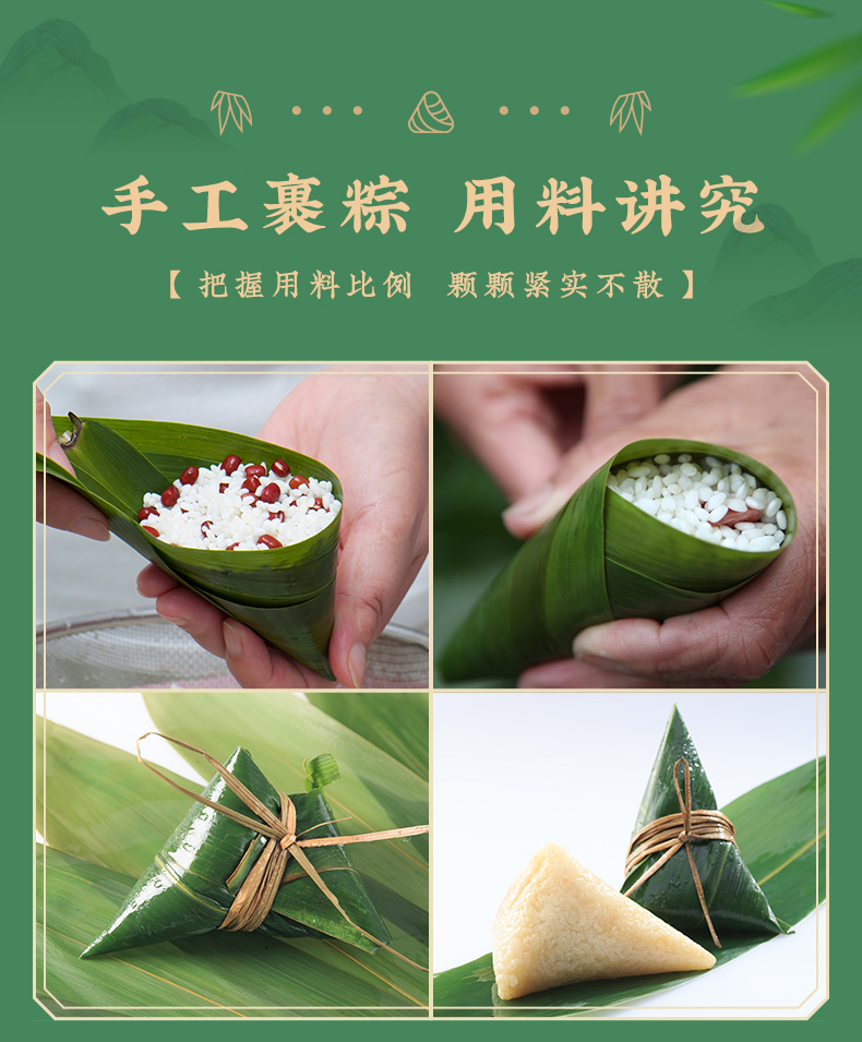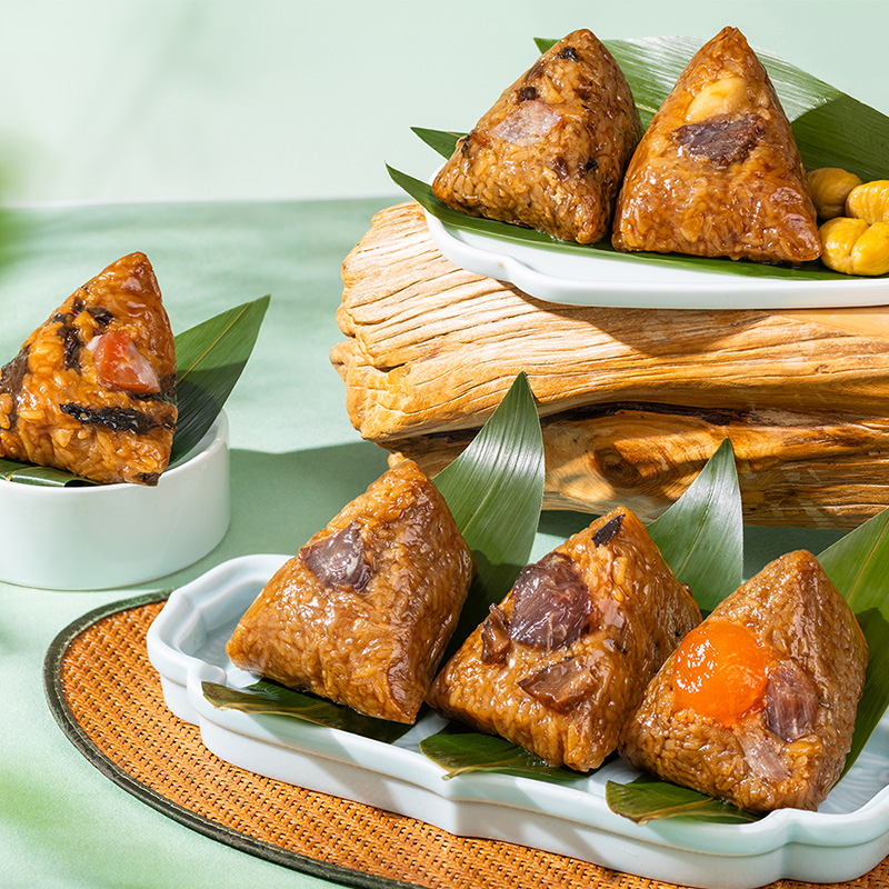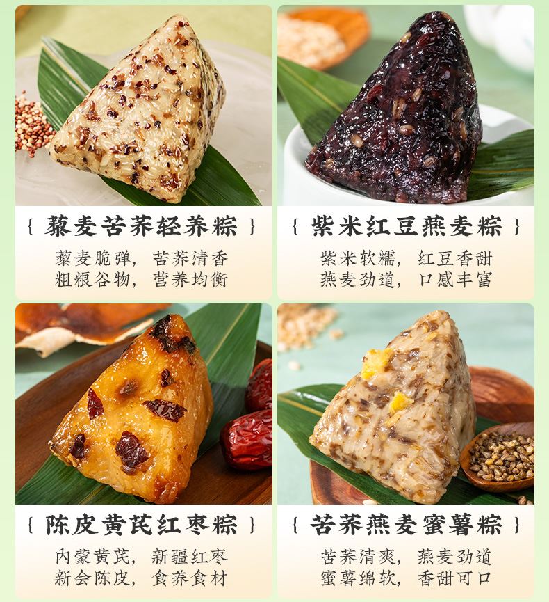 4.甜粽为食养粽,手工裹粽,精心烹调,用野生高山箬叶,包裹东北糯米,再分别融入五谷杂粮、燕麦、百合、三色藜麦、苦荞等食材,口感黏糯而有韧劲,百谷成粽,粗粮配比,健康食养,老少皆宜;肉粽均选用猪后腿肉,肉质鲜嫩,搭配油润咸蛋黄、糯香栗子、梅干菜等食材,营养丰富,每一个粽子都鲜香诱人,油香四溢。