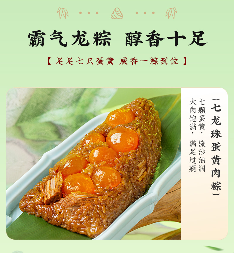 1.七龙珠粽是创新粽,集齐七蛋黄,主打料足味美!甄选油润起沙咸鸭蛋黄作为主食材,口感咸香十足,一枚粽子过足瘾!