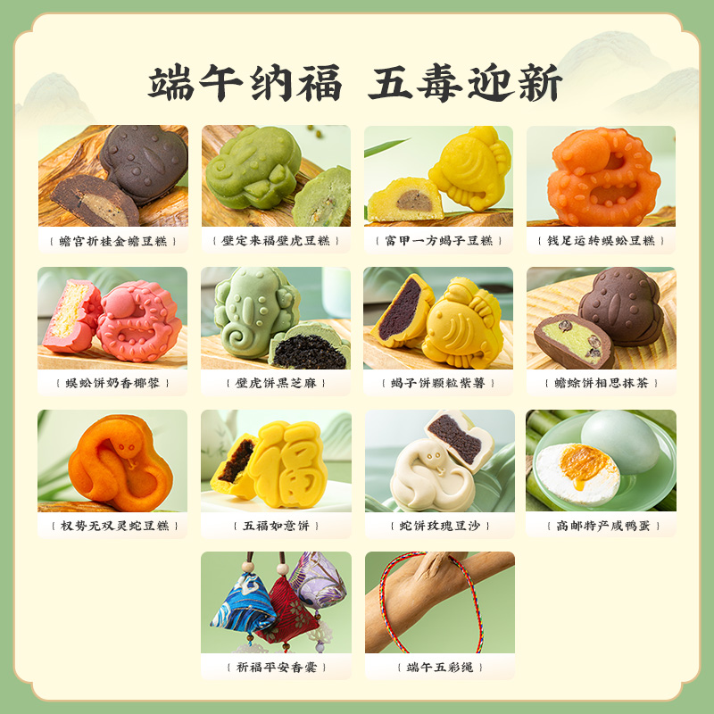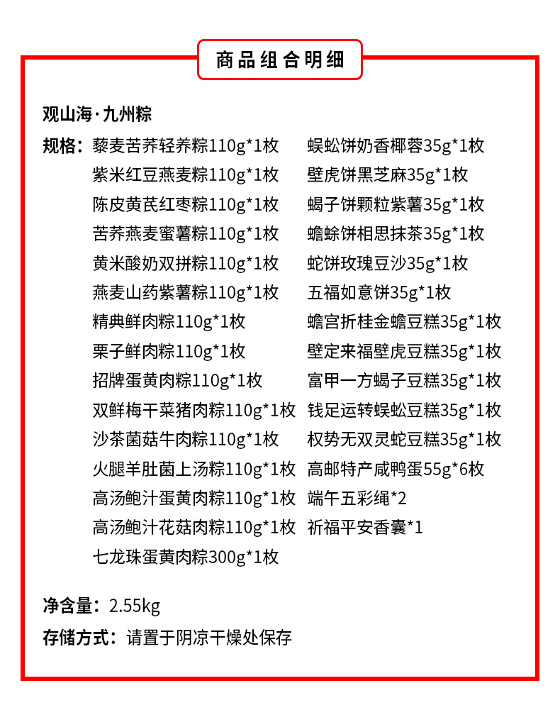 产品卖点:推荐人群:南咸北甜粽皆备,端午节要尝鲜以及商务送礼的人群15味15粽(1味七龙珠长粽+2味高汤粽+6味甜粽+6味肉粽+五毒系列糕饼(11枚)+6枚高邮咸鸭蛋+五彩绳+平安香囊