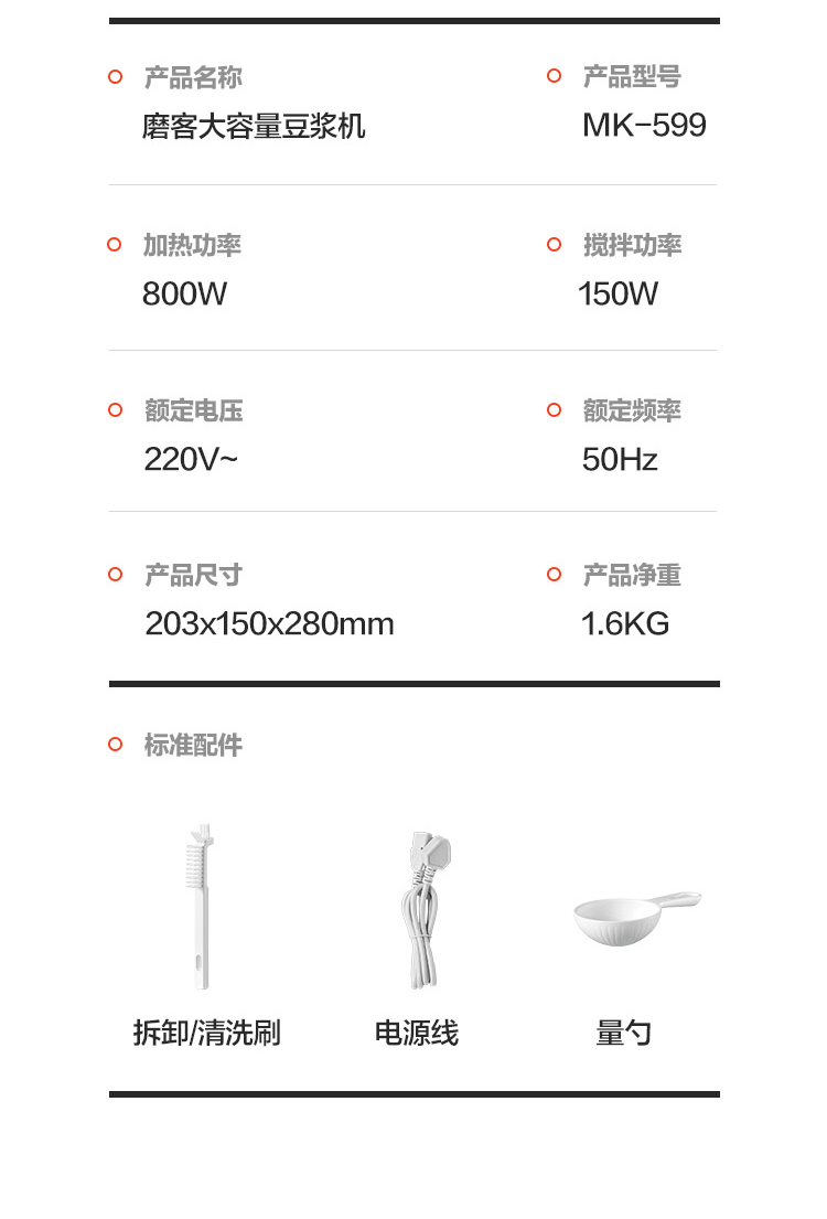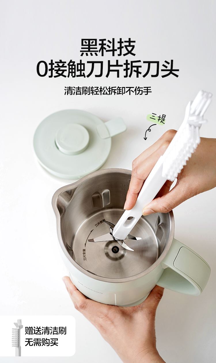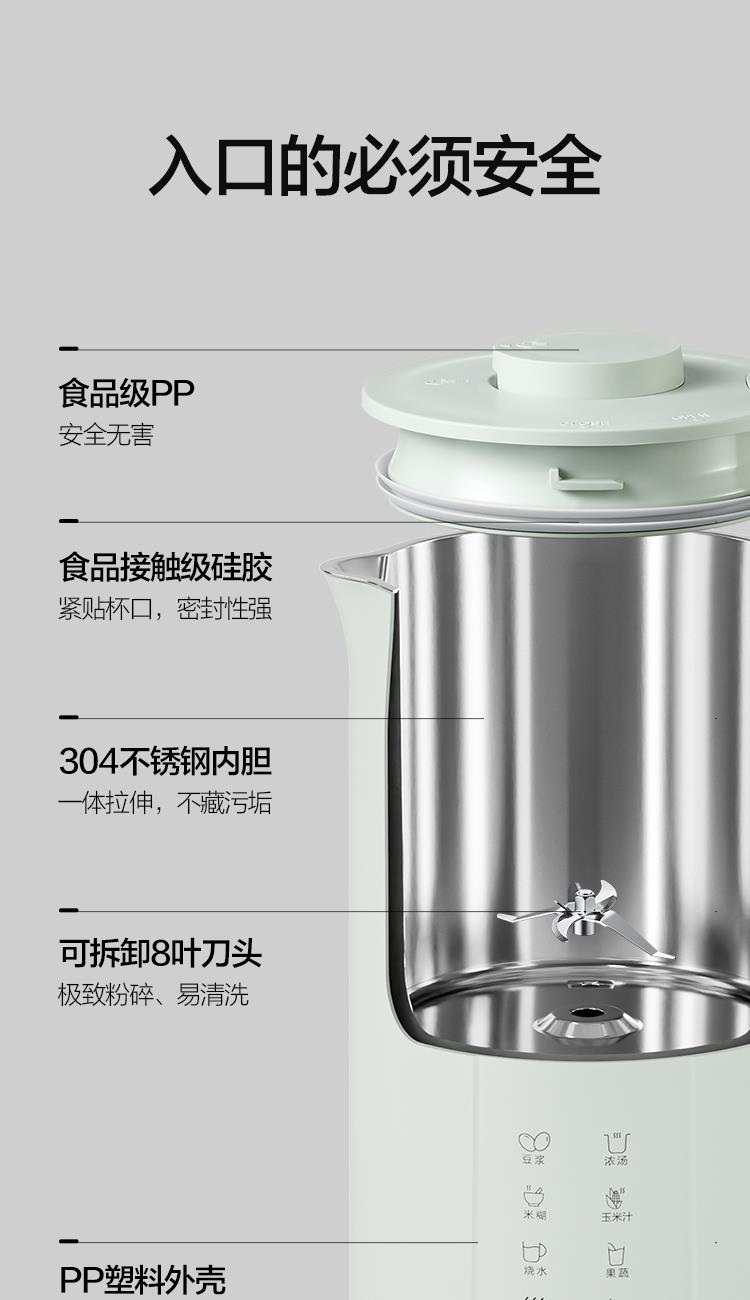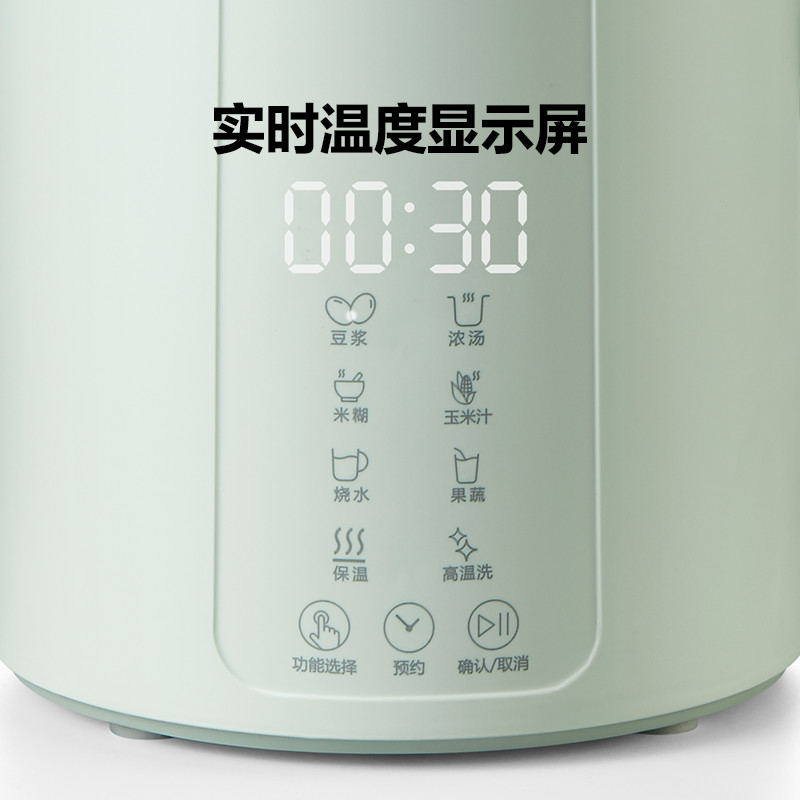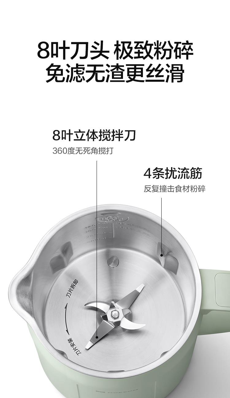 产品尺寸:215*150*285mm 净重:1.6KG 毛重:2.15KG 容量:1200ml 加热功率:800W 搅拌功率:150W 1.黑科技,不碰刀拆卸刀头,底部清洗不藏污 2.1200ml大容量,免泡豆直接打 3.一键高温洗,自动清洁 4.8叶刀头,免滤无渣更丝滑 5.实时温度显示,烹饪进度轻松掌控 6.4H长效保温,八档功能调节,你的好助手 7.12小时预约,起床就有早餐吃 8.自带高原煮水模式,海拔2000M可沸腾