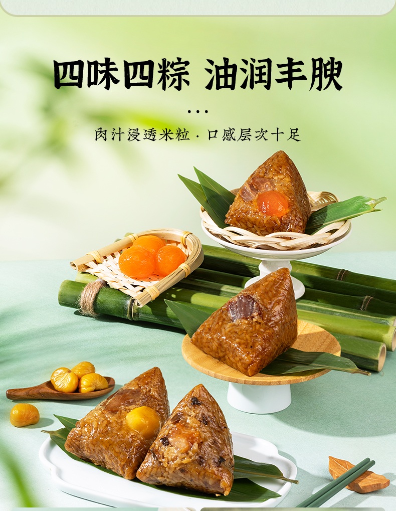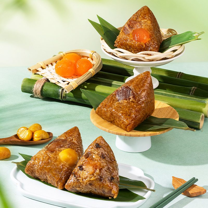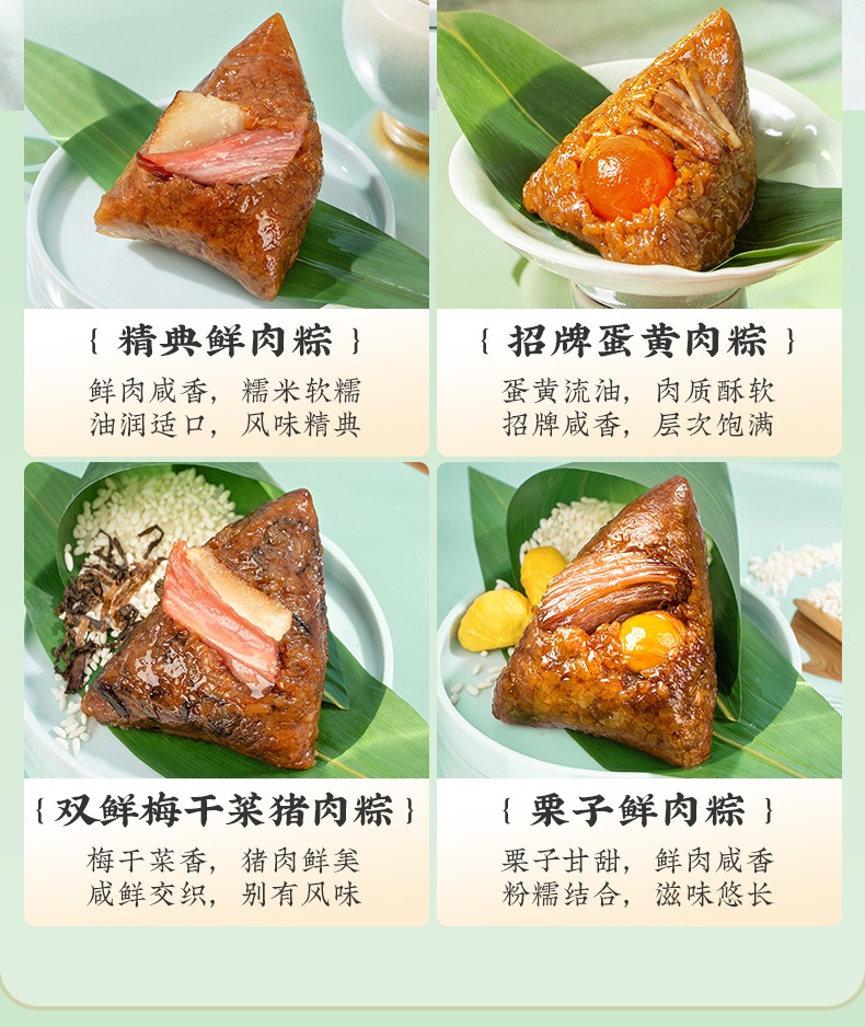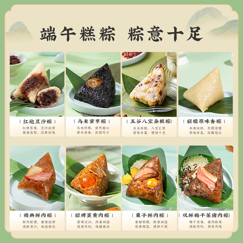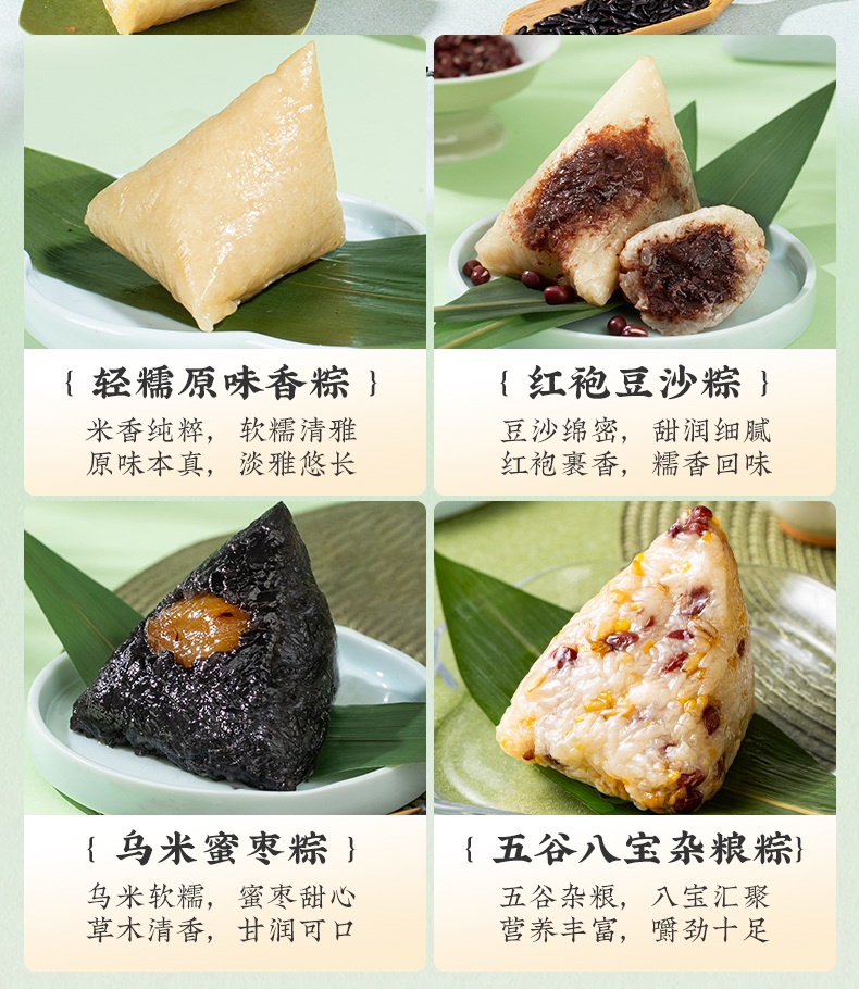 2、甜咸口味一应俱全:轻糯原味、红袍豆沙、乌米蜜枣、五谷八宝粽清甜不齁、温润适口;经典鲜肉、招牌蛋黄肉、梅干菜猪肉、栗子鲜肉粽咸香入味、油润不腻