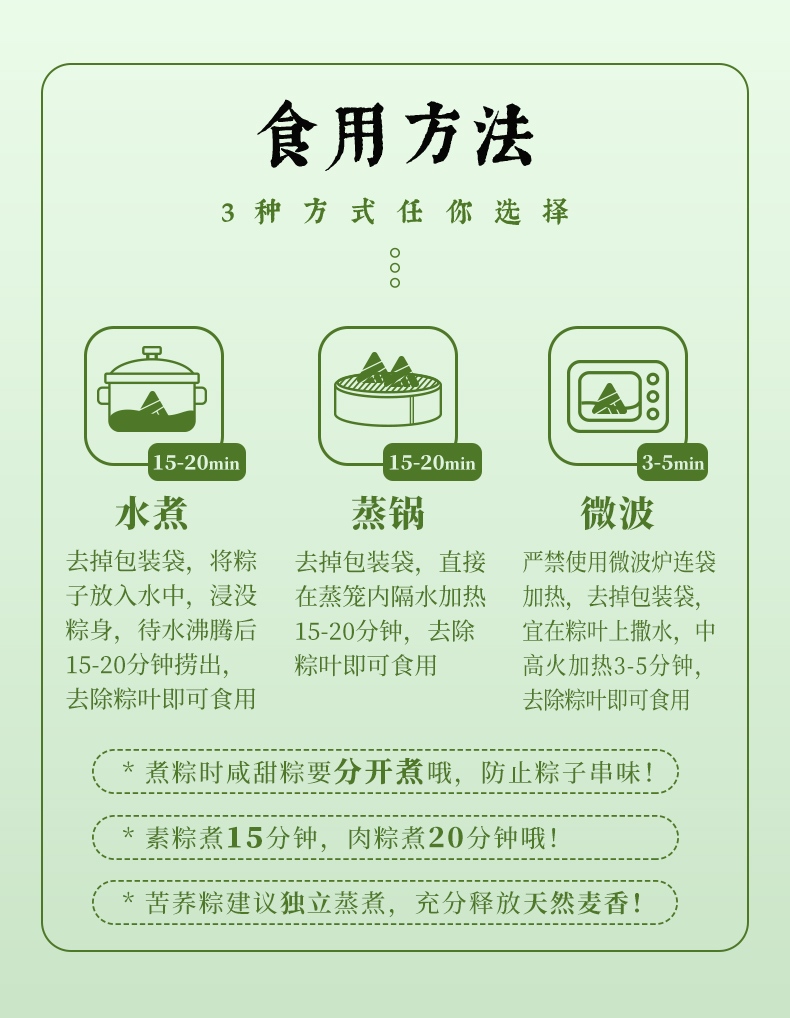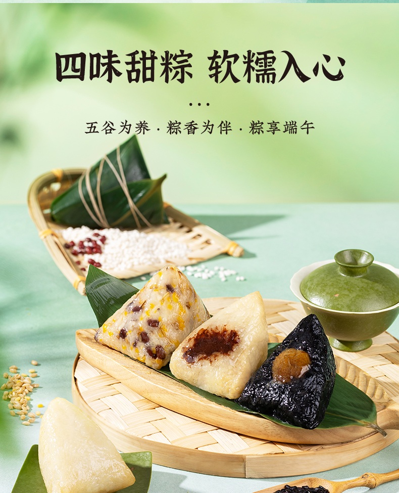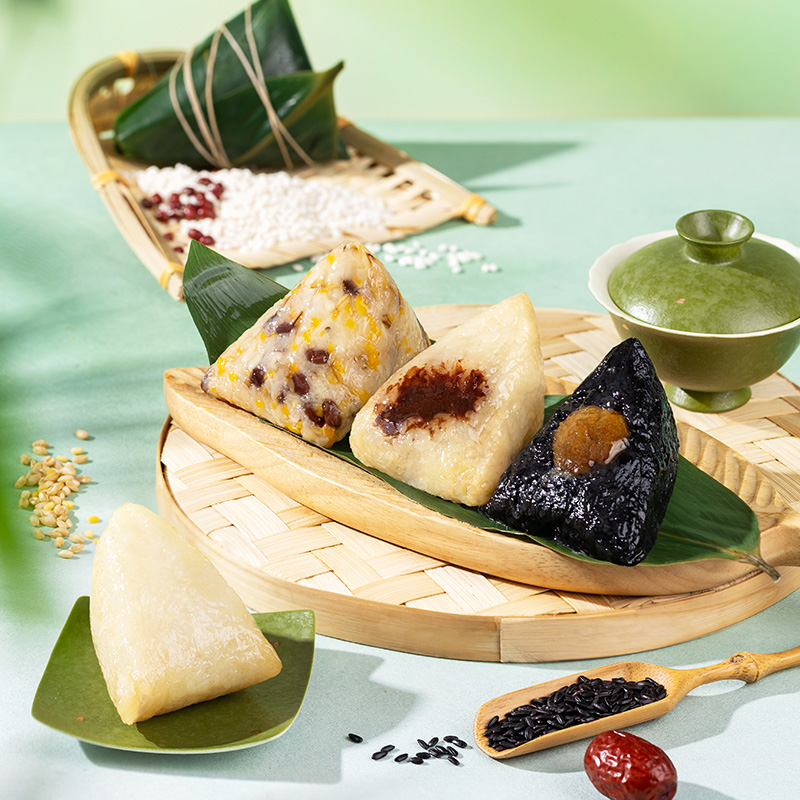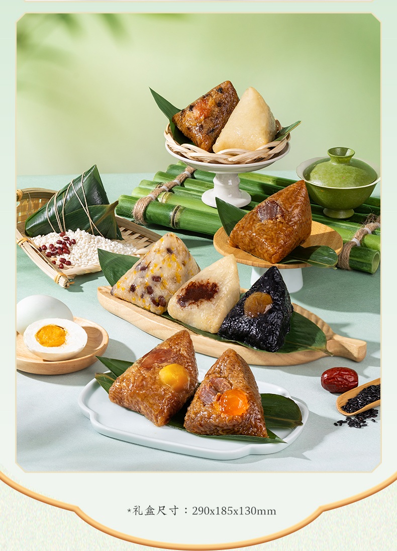 2、甜咸口味一应俱全:轻糯原味、红袍豆沙、乌米蜜枣、五谷八宝粽清甜不齁、温润适口;经典鲜肉、招牌蛋黄肉、梅干菜猪肉、栗子鲜肉粽咸香入味、油润不腻