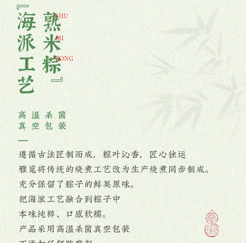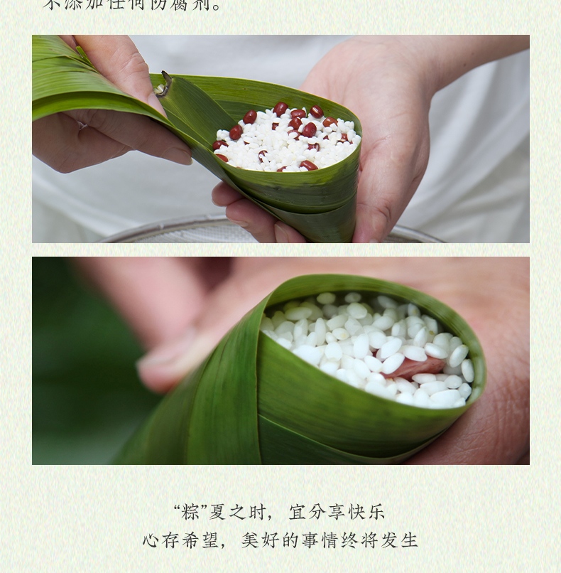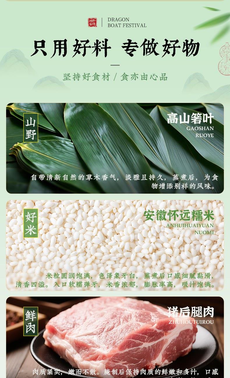 1、甄选地标安徽怀远糯米,颗粒饱满,口感软糯绵密有嚼劲;搭配野生高山箬叶,叶香清鲜,将自然清香沁入粽米,米香、料香、叶香层层交融