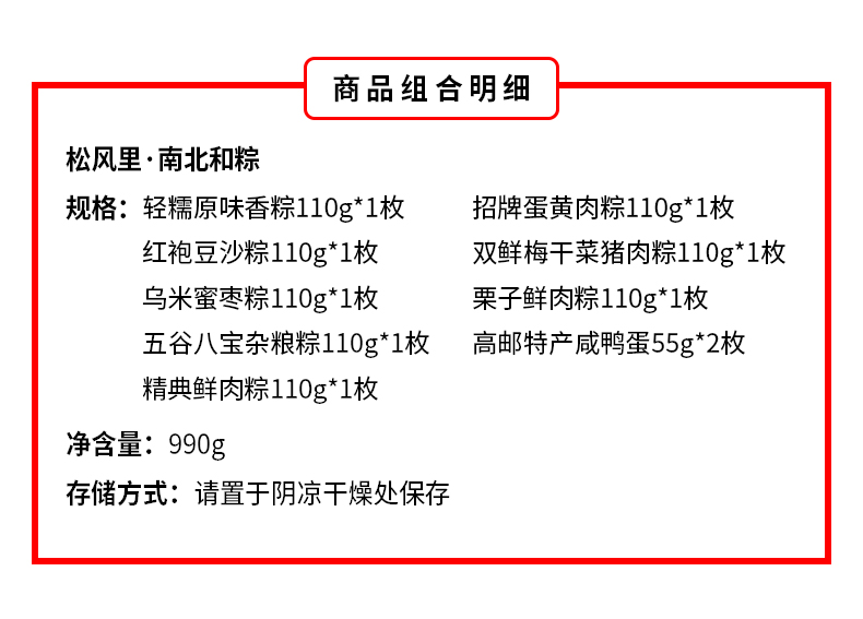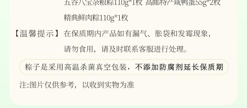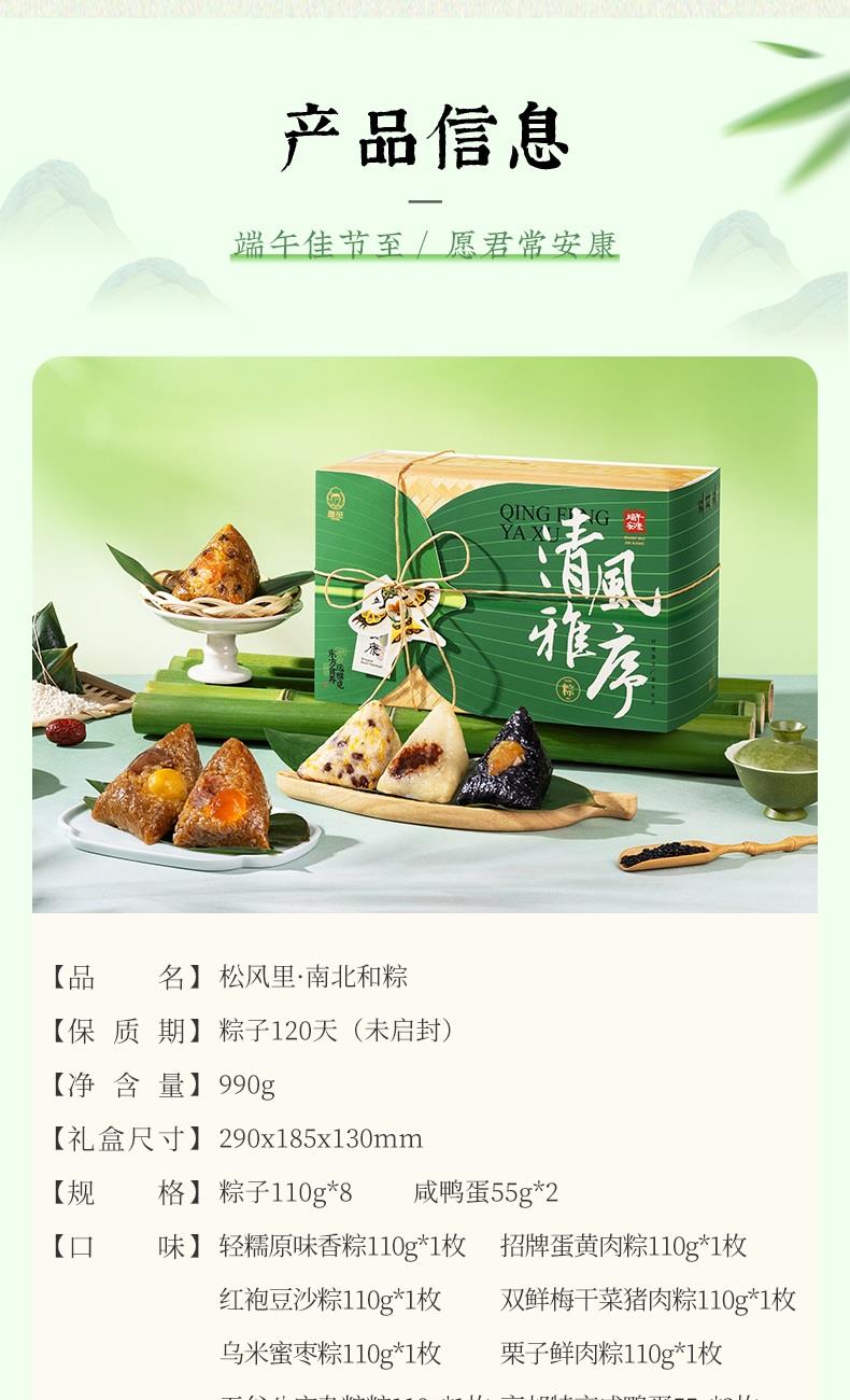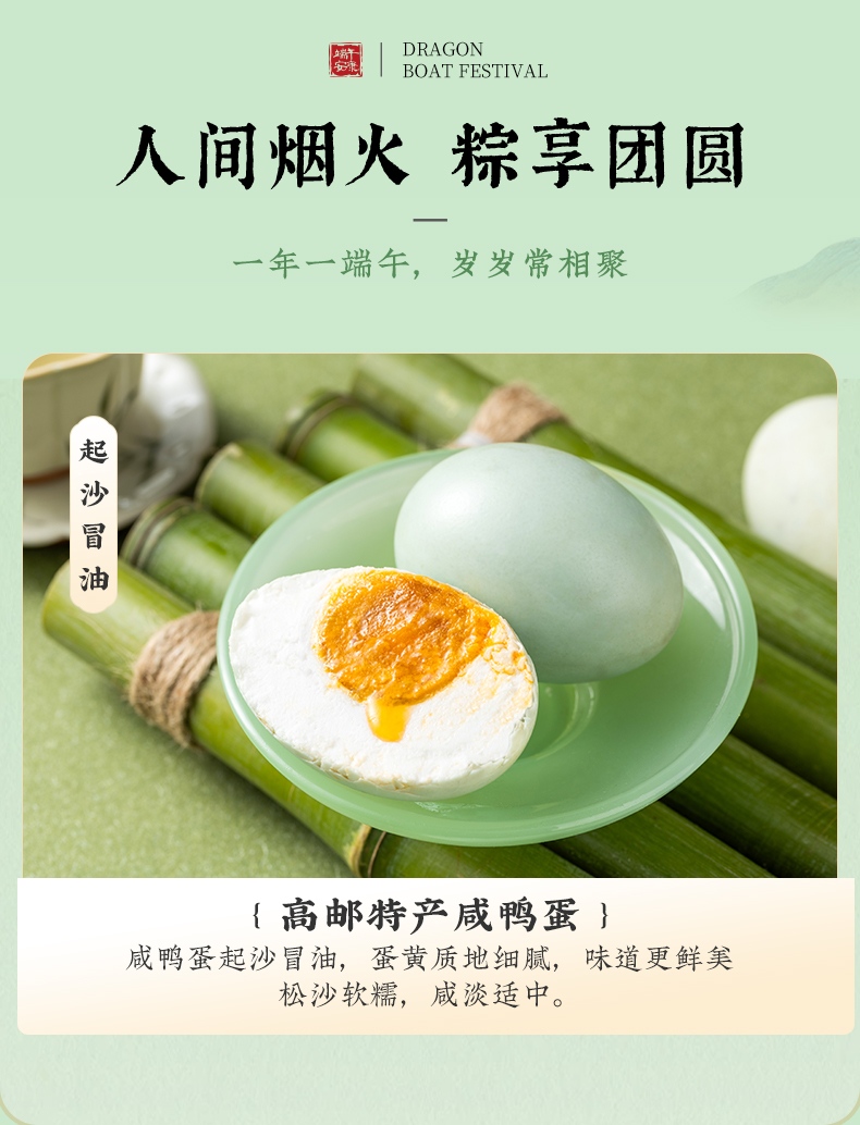 产品卖点:八款风味粽+高邮特产咸鸭蛋,甜咸兼备、荤素搭配,口味丰富