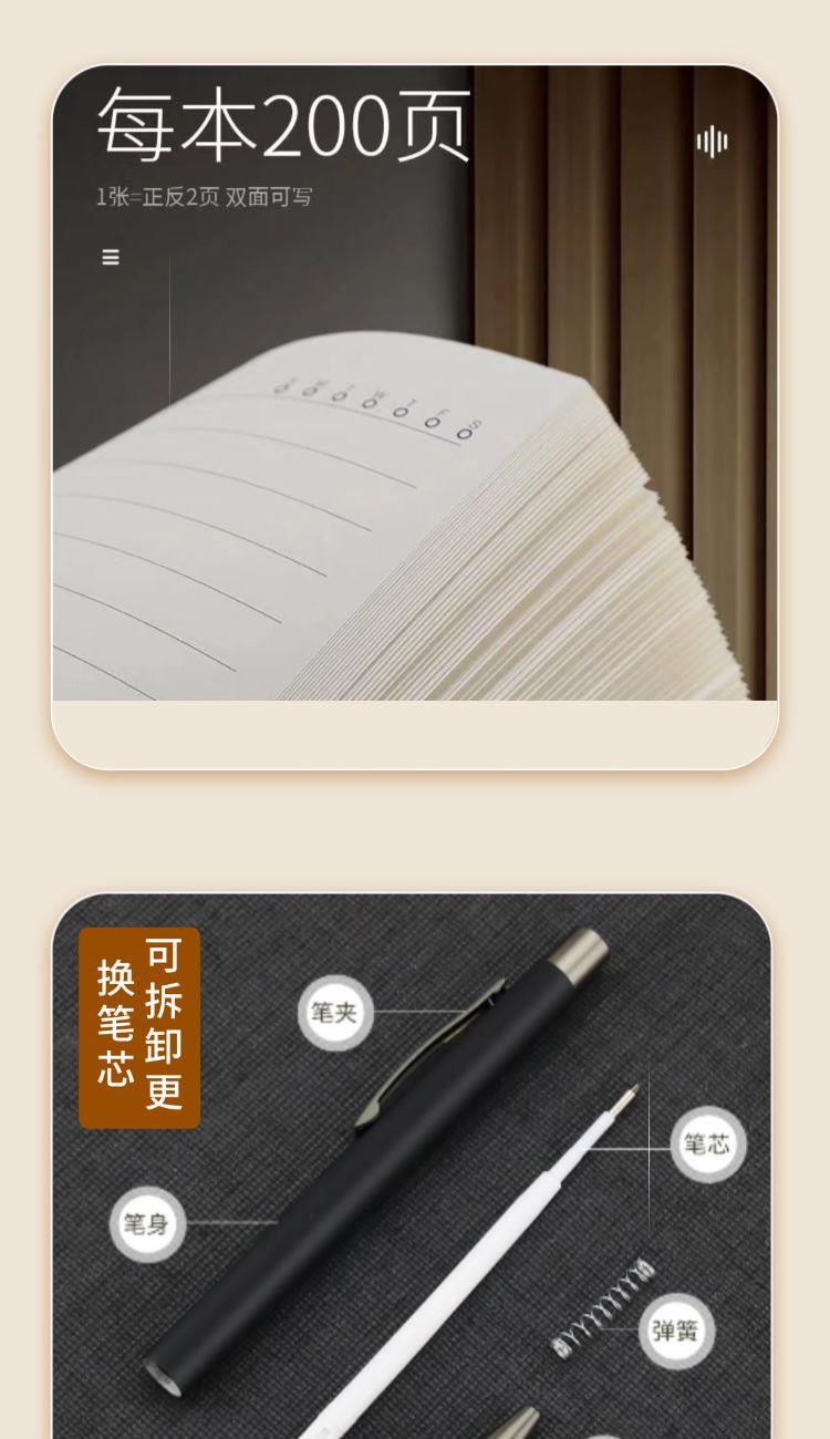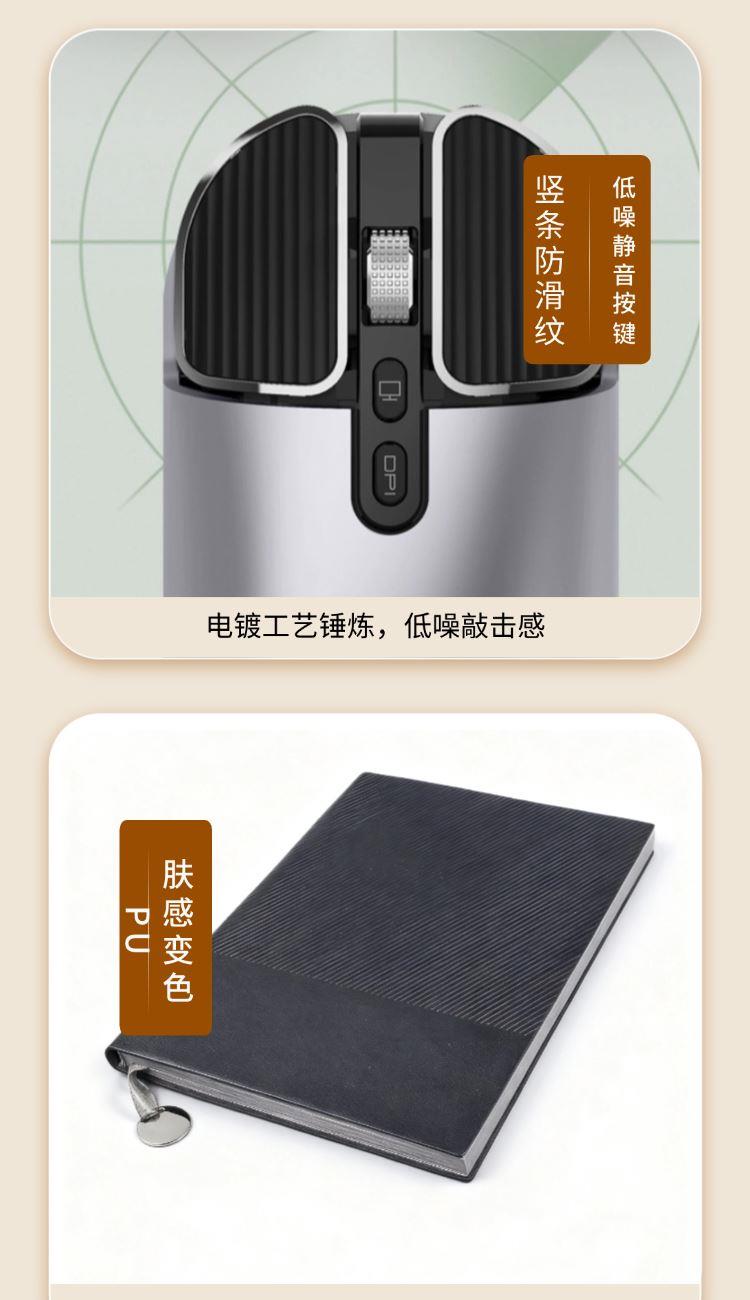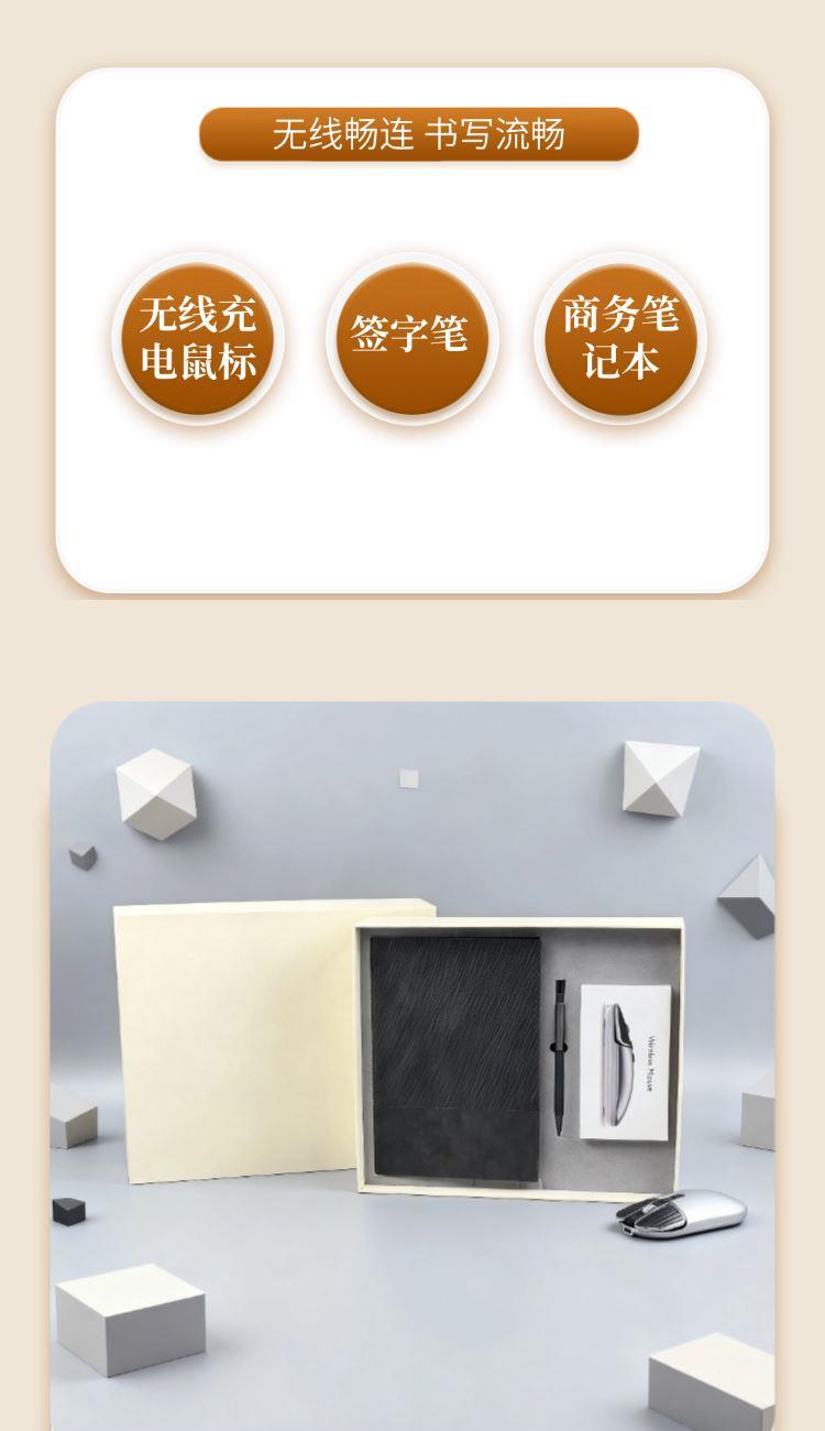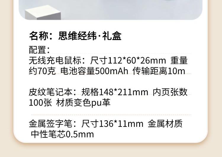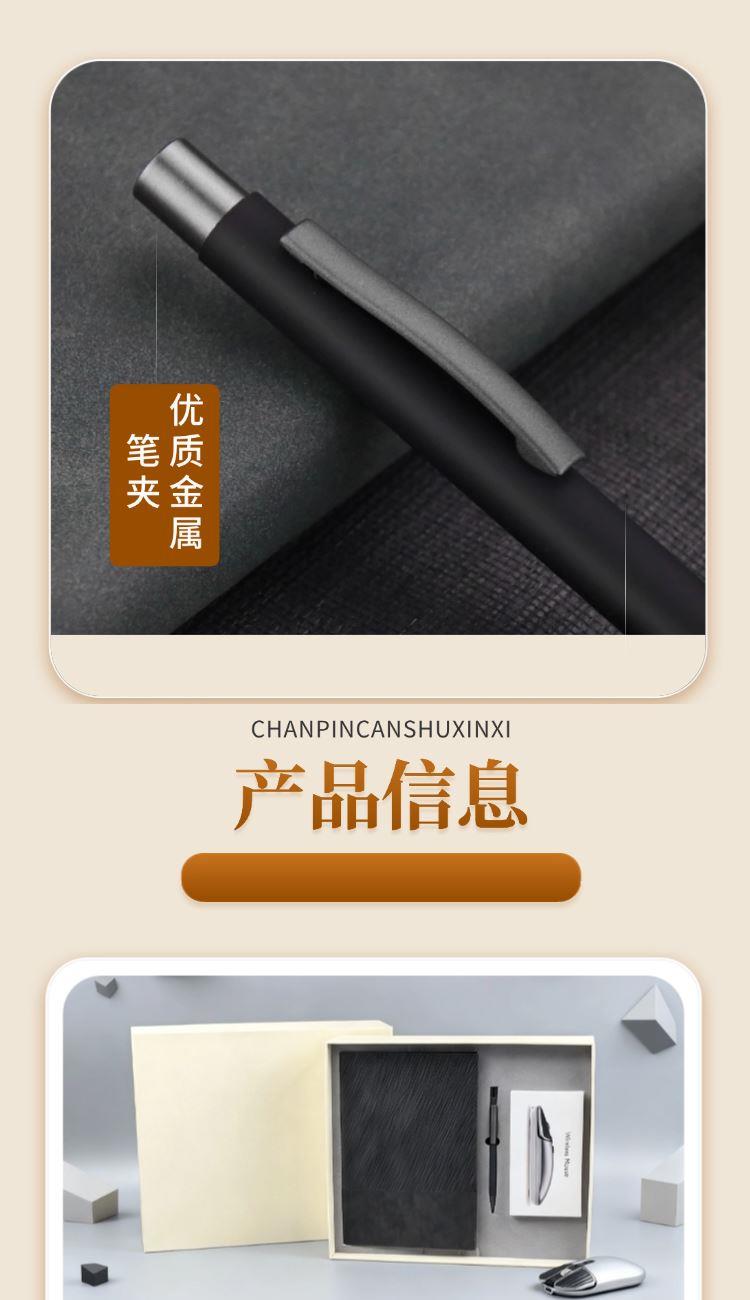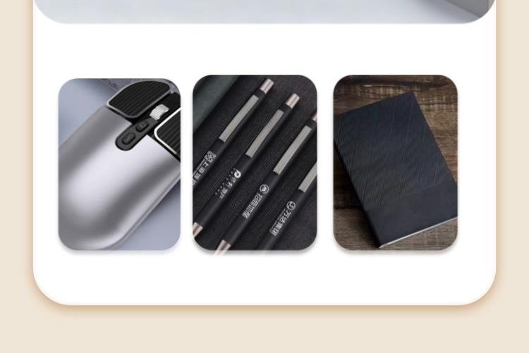金属签字笔 产品材质:金属材质 单支尺寸:136*11mm 单支克重:16g 中性笔芯:0.5mm 皮纹笔记本 规格:148*211mm 内页张数:100张 内页材质:80克道林 封面材质:变色pu革 充电鼠标 产品尺寸:112*60*26mm 重量:约70g 电池容量:500mAh 传输距离:10m 供电模式:可充锂电池